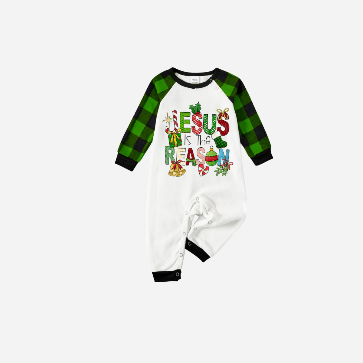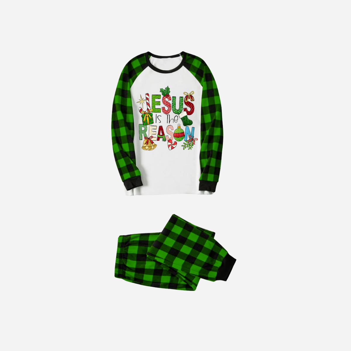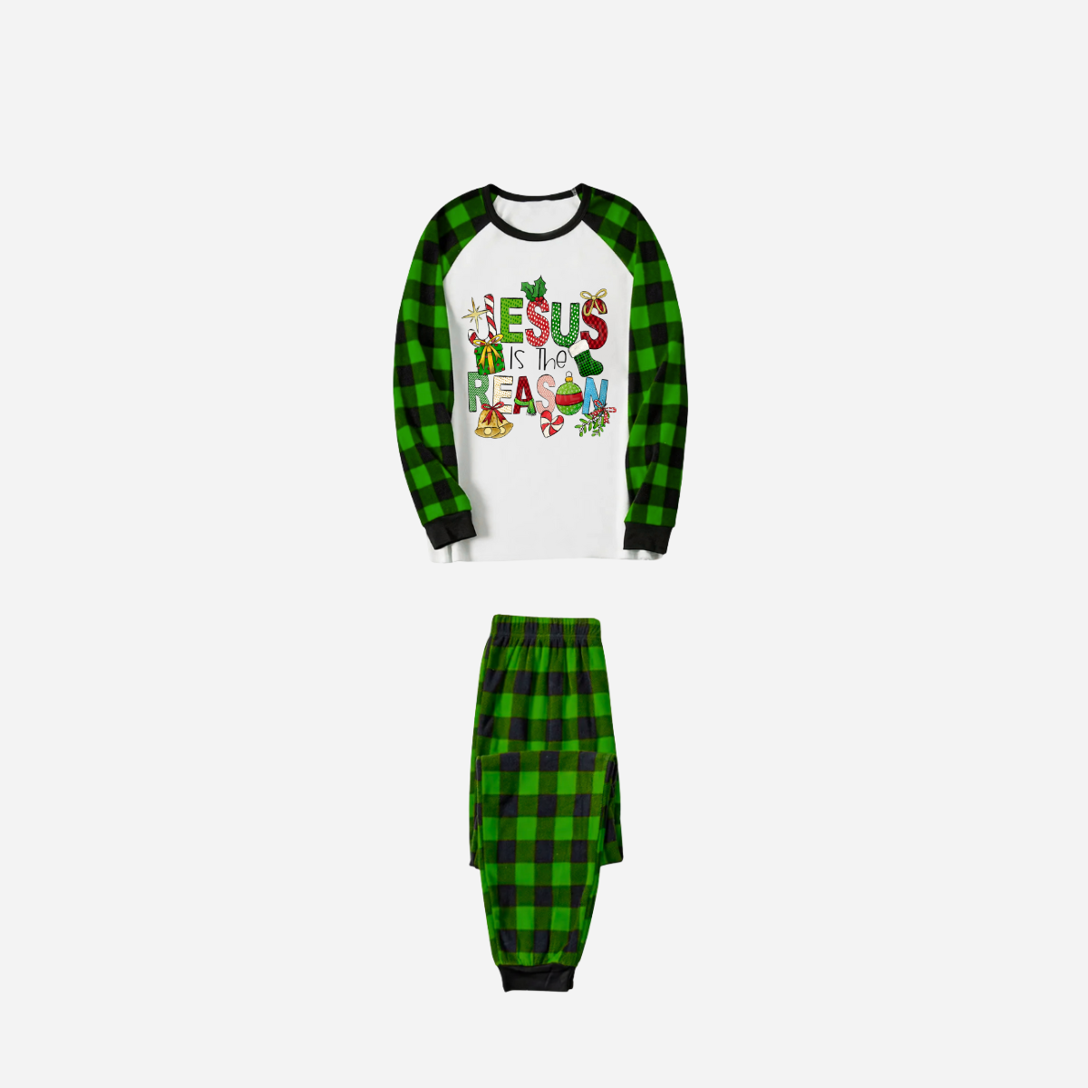 • Christmas Cartoon Family Christmas Pajamas Set - White Top with Green Plaid Sleeves and Green Plaid Pants and “Jesus is the Reason” Design
