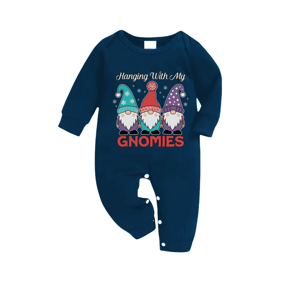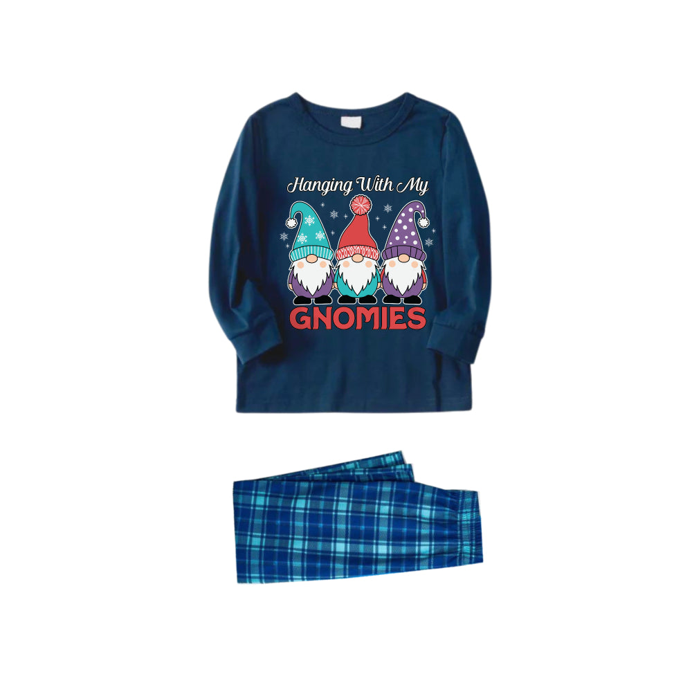 • Christmas Family Matching Pajamas-Navy & Sky Blue Plaid Pjs Set with "Hanging With My Gnomies" and Gnome Cartoon Print