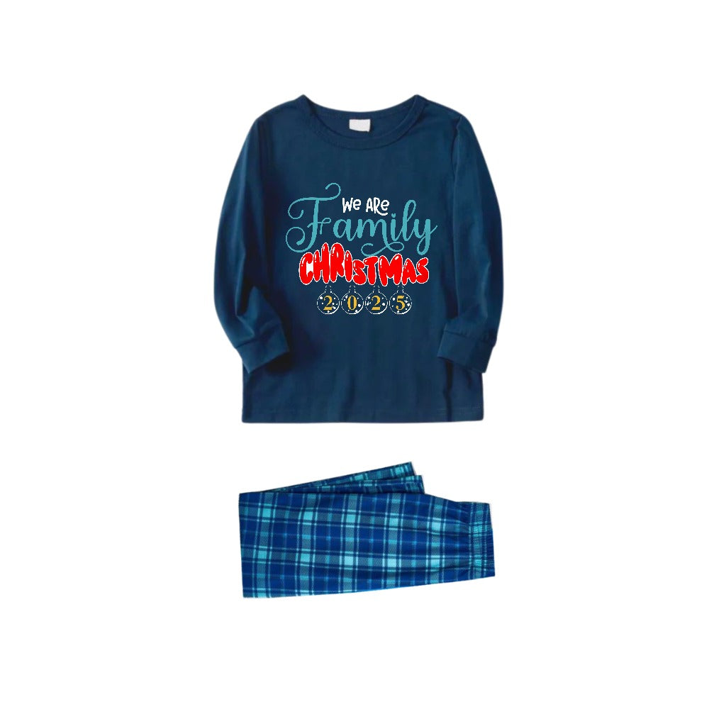 • Christmas Family Matching Pajamas-Navy & Sky Blue Plaid Pjs Set with "We Are Family" Christmas Slogan Print