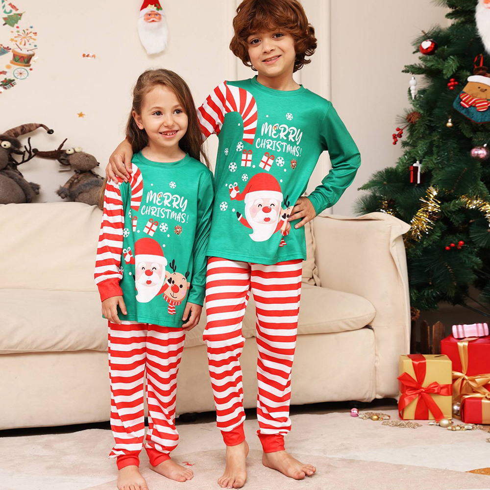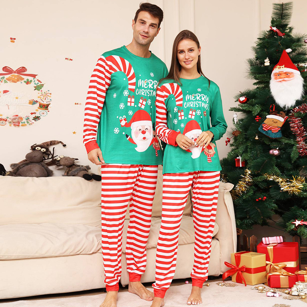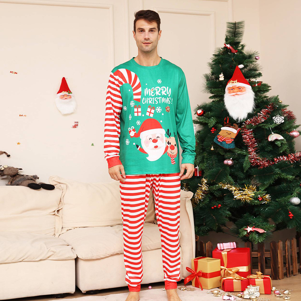Christmas Family Matching Pajamas Set Green Santa Claus Red Stripes Pajamas