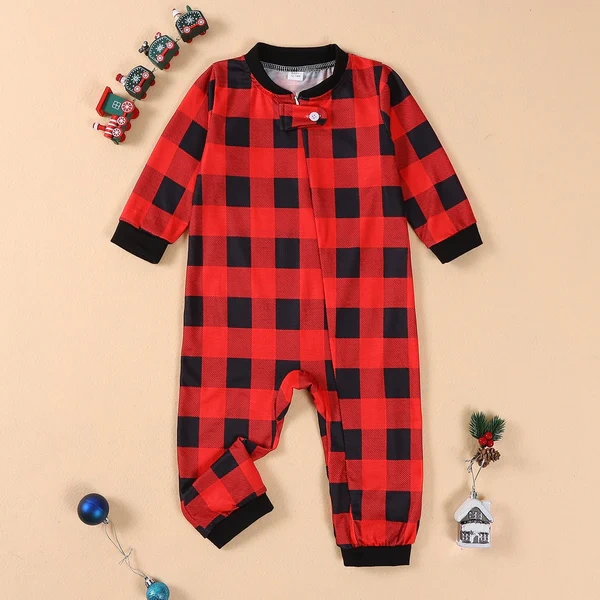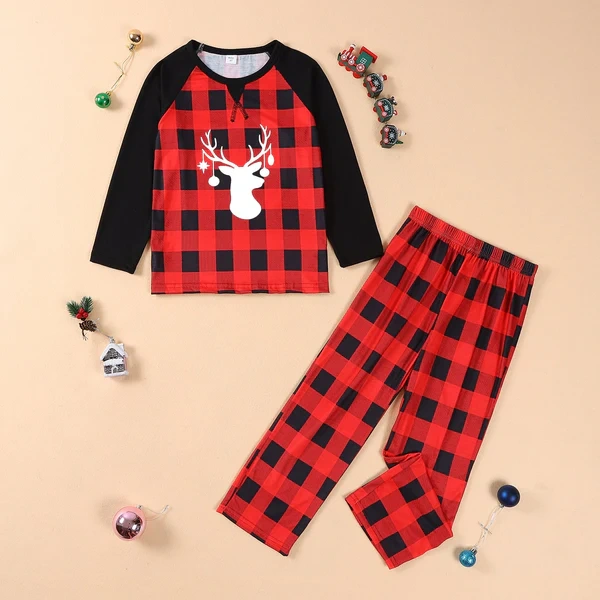• Christmas Family Pajamas Matching Set Long Sleeve Elk Print T-shirt with Plaid Trousers