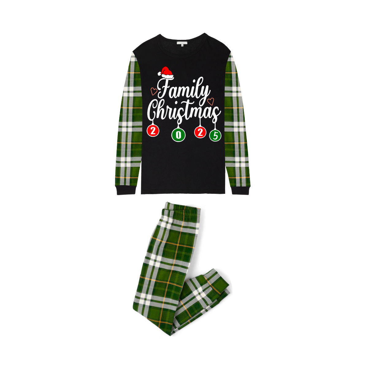 Family Christmas 2026 Pajamas Set - Black Top / Green Plaid Sleeves & Pants / Santa Hat Print