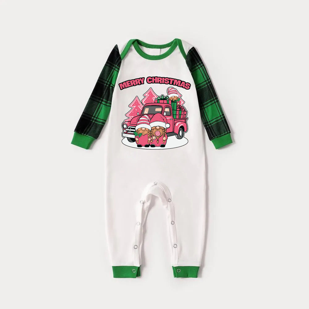 • Green Raglan Top Green Plaid Christmas Pajamas Set With Pink Gnomes and "MERRY CHRISTMAS" Print
