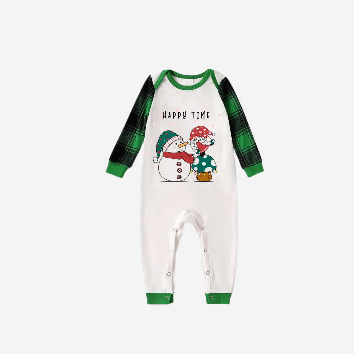 • Green Raglan Top Green Plaid Christmas Pajamas Set With Snowman and Gnome and "Happy Time" Text Print