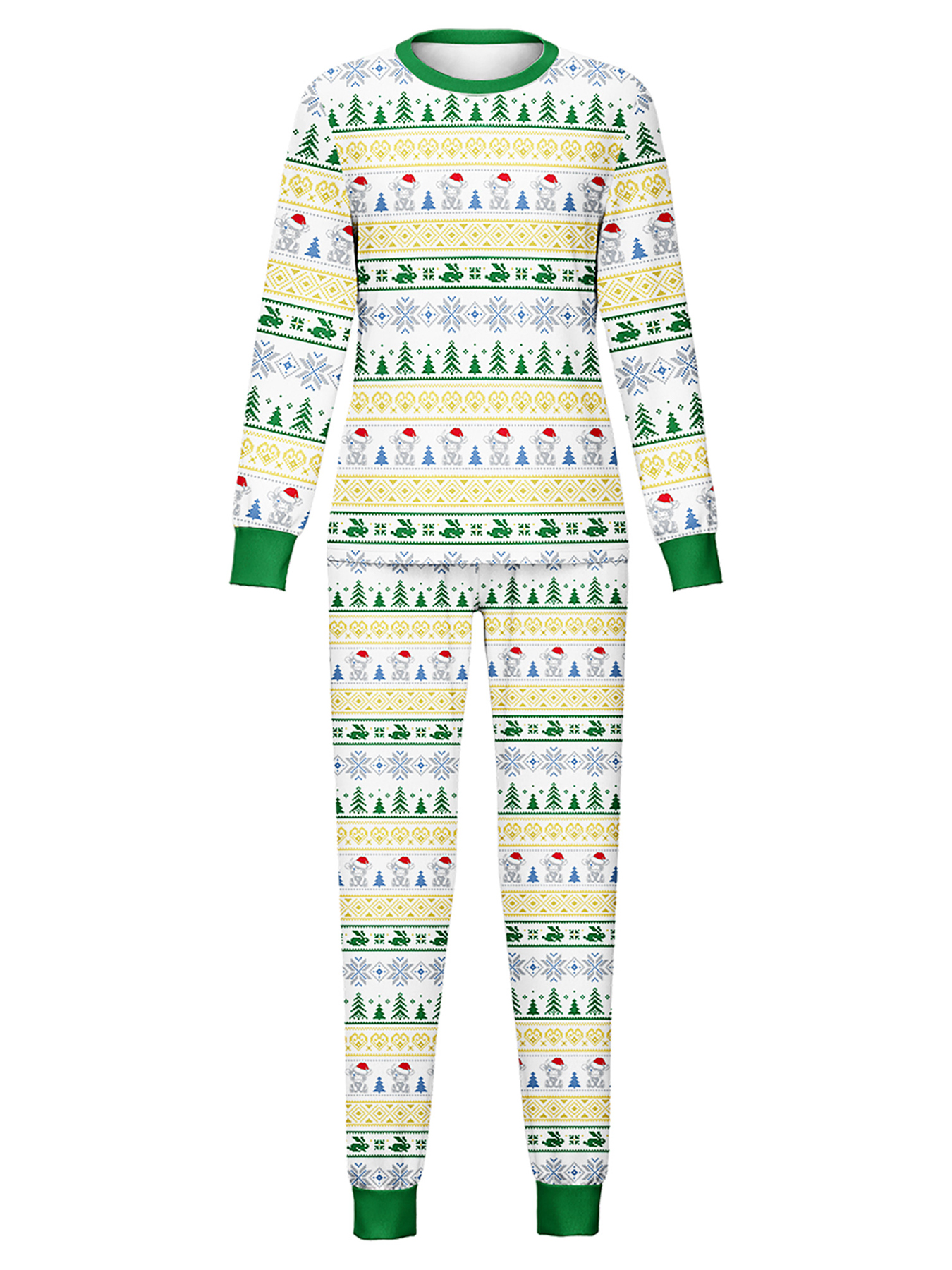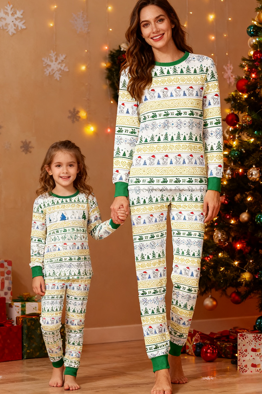A mother and daughter, glowing with joy in matching festive pajamas, share a tender moment before their beautifully adorned Christmas tree, surrounded by the warmth of holiday decorations.​ No one can resist the warmth and joy of Christmas and the New Year. Let the whole family wear these special Christmas-themed pajamas together!