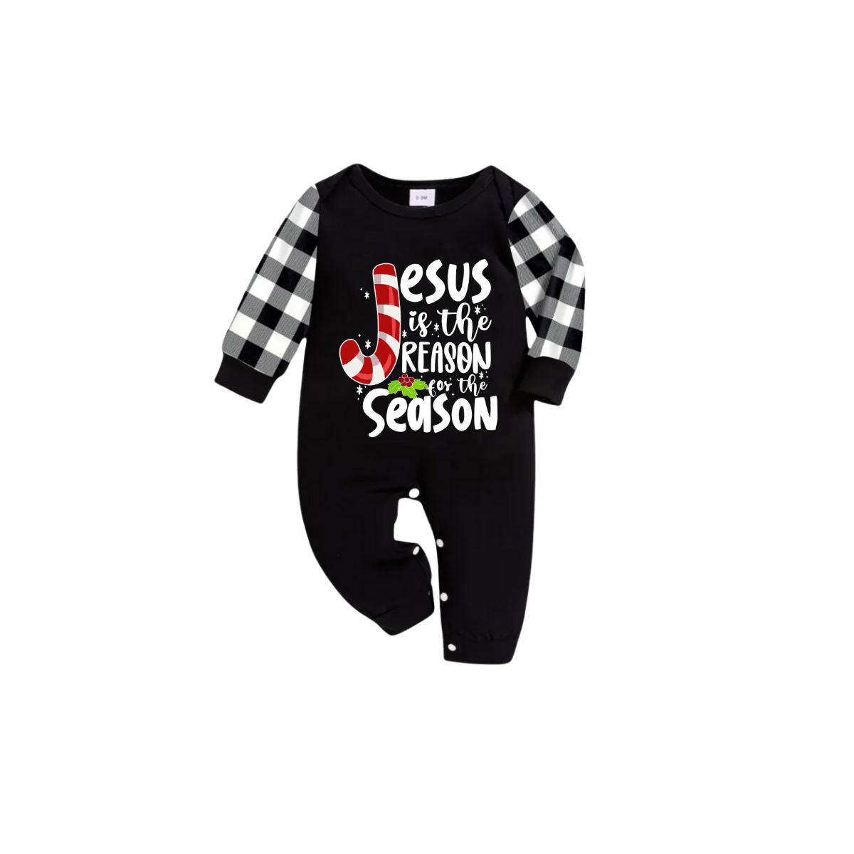 • Jesus Is The Reason For The Season Family Christmas Pajamas Set - Black Top Black and White Plaid Pants White Graphic Text