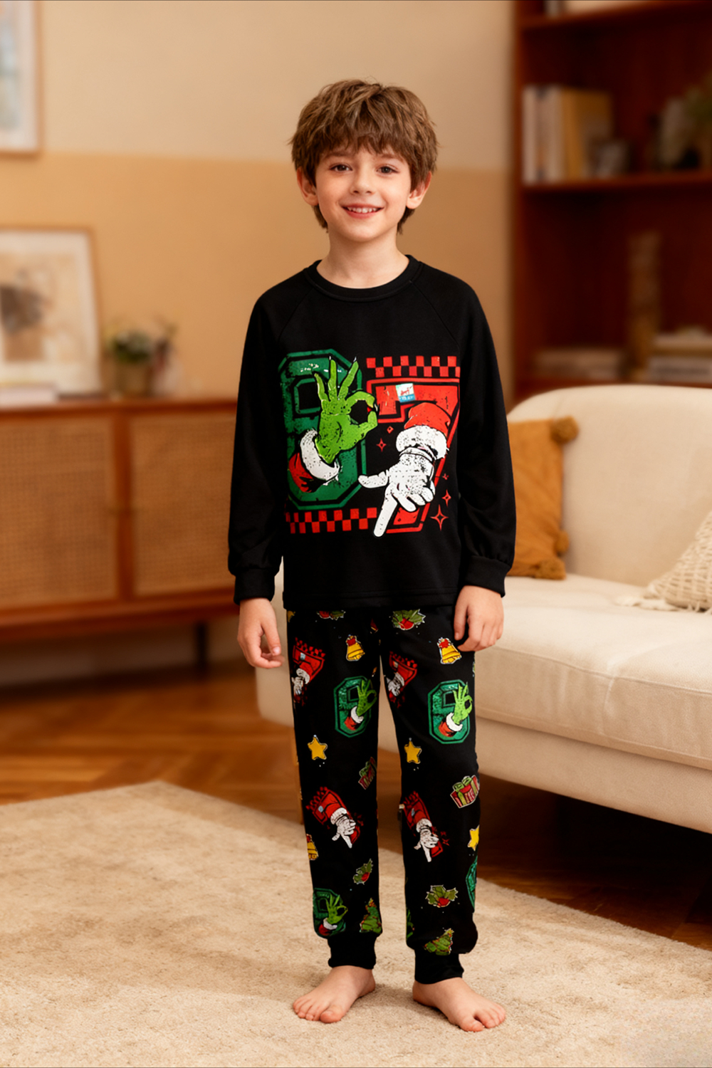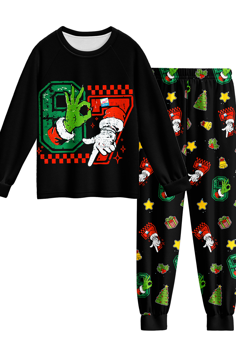 This awesome black set features a light-up green monster hand and Santa giving a SIX SEVEN, with pants full of festive prints. Super soft, fun to wear, and perfect for making Christmas morning magical! These unique SIX SEVEN pajamas make the ultimate holiday gift.