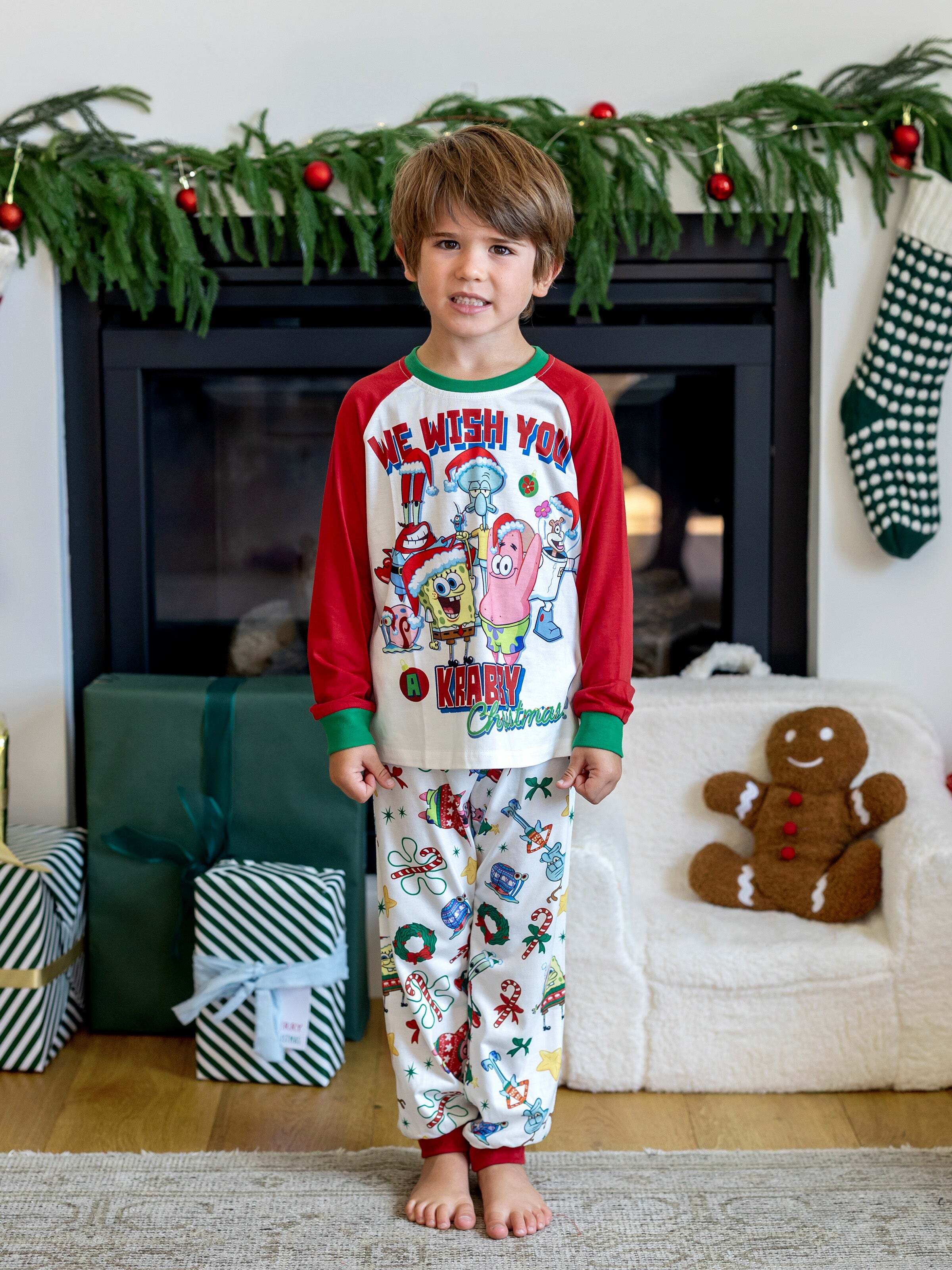 • Product features: Flame-resistant for safety, soft knit fabric, red and white color-block design with "We Wish You a Krabby Christmas" graphic and holiday-themed pants.