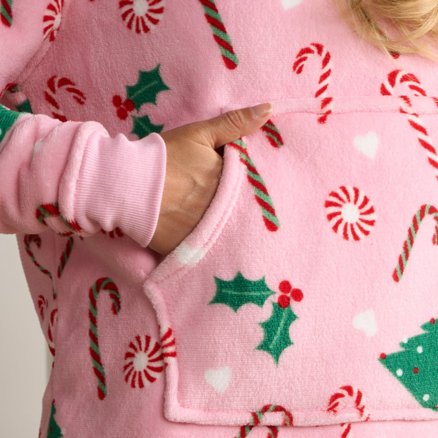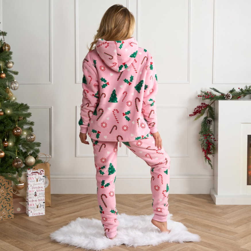 OHS Adults Christmas Candy Cane Fleece Hoodie Pyjama Set