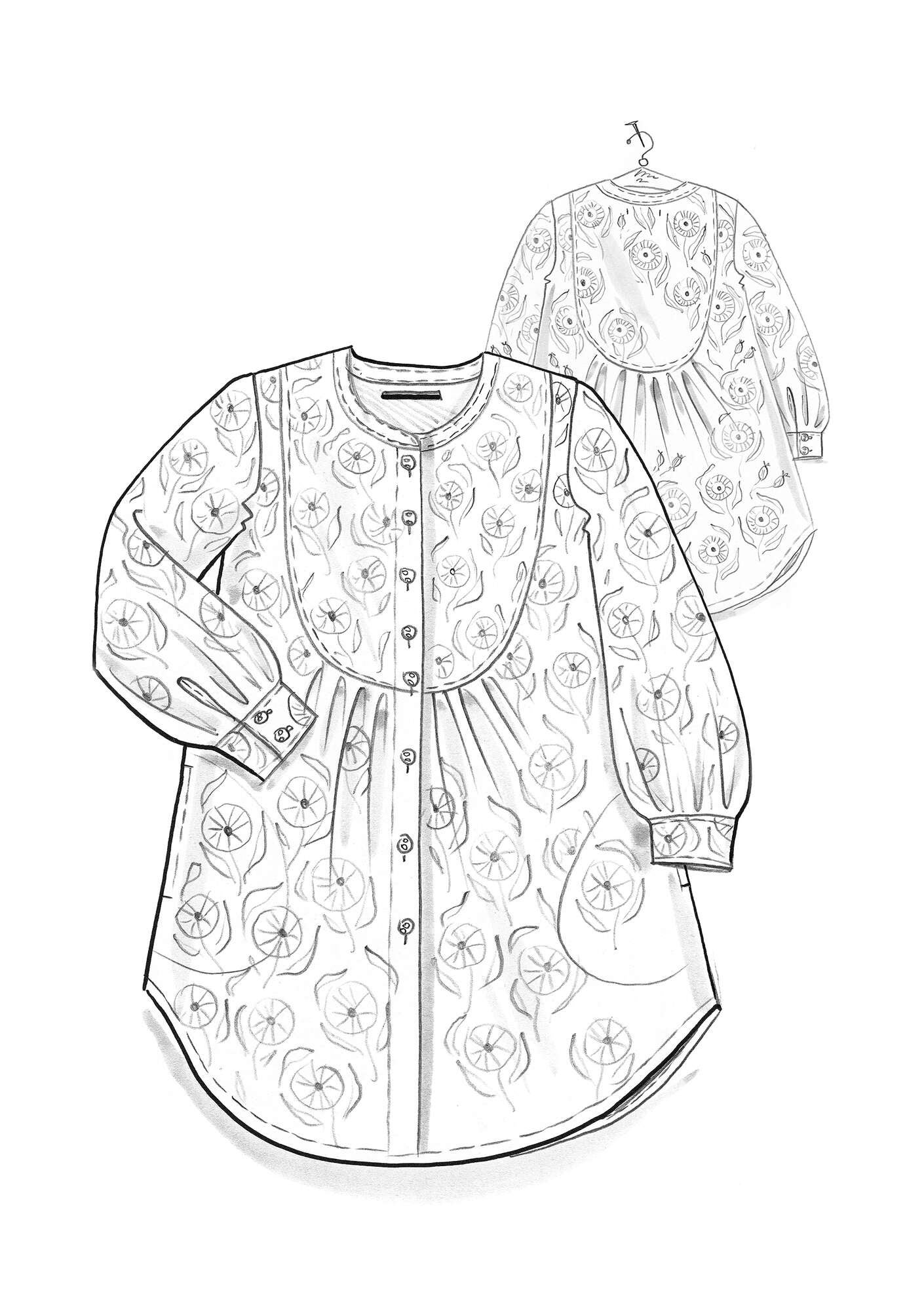 Shirt dress in a choice of two printed designs. Button-through with a curved hem. It has a shaped panel on the front of the bodice, long sleeves with buttoned cuffs and gathers at the yoke on the back. A neat mandarin collar and fabric-covered buttons.