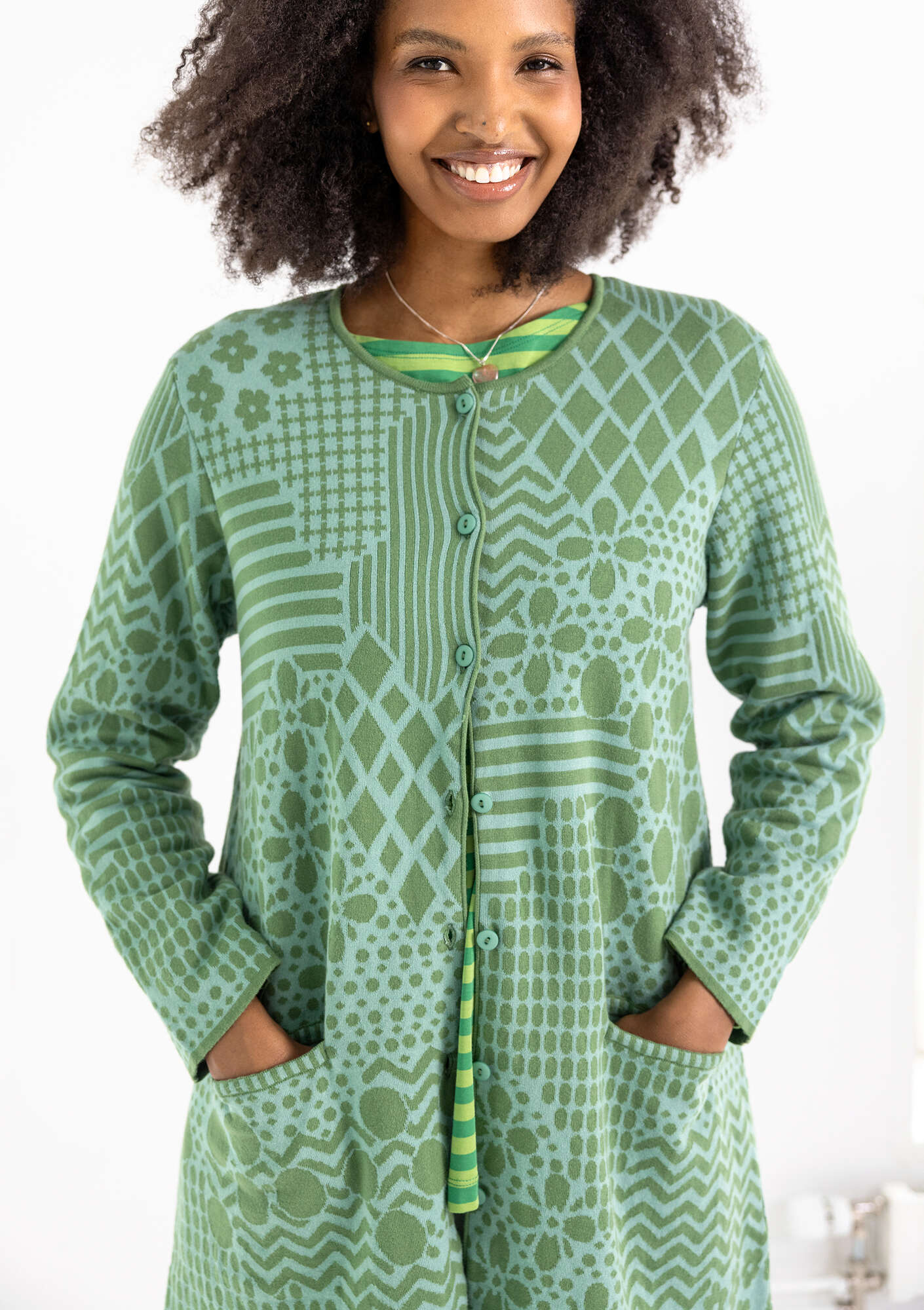 • Jacquard cardigan with full-length sleeves. Double-sided, two-tone pattern in easy-wear colours. Extremely beautiful on the inside too. Subtly designed pockets, striped inside. Dyed buttons.