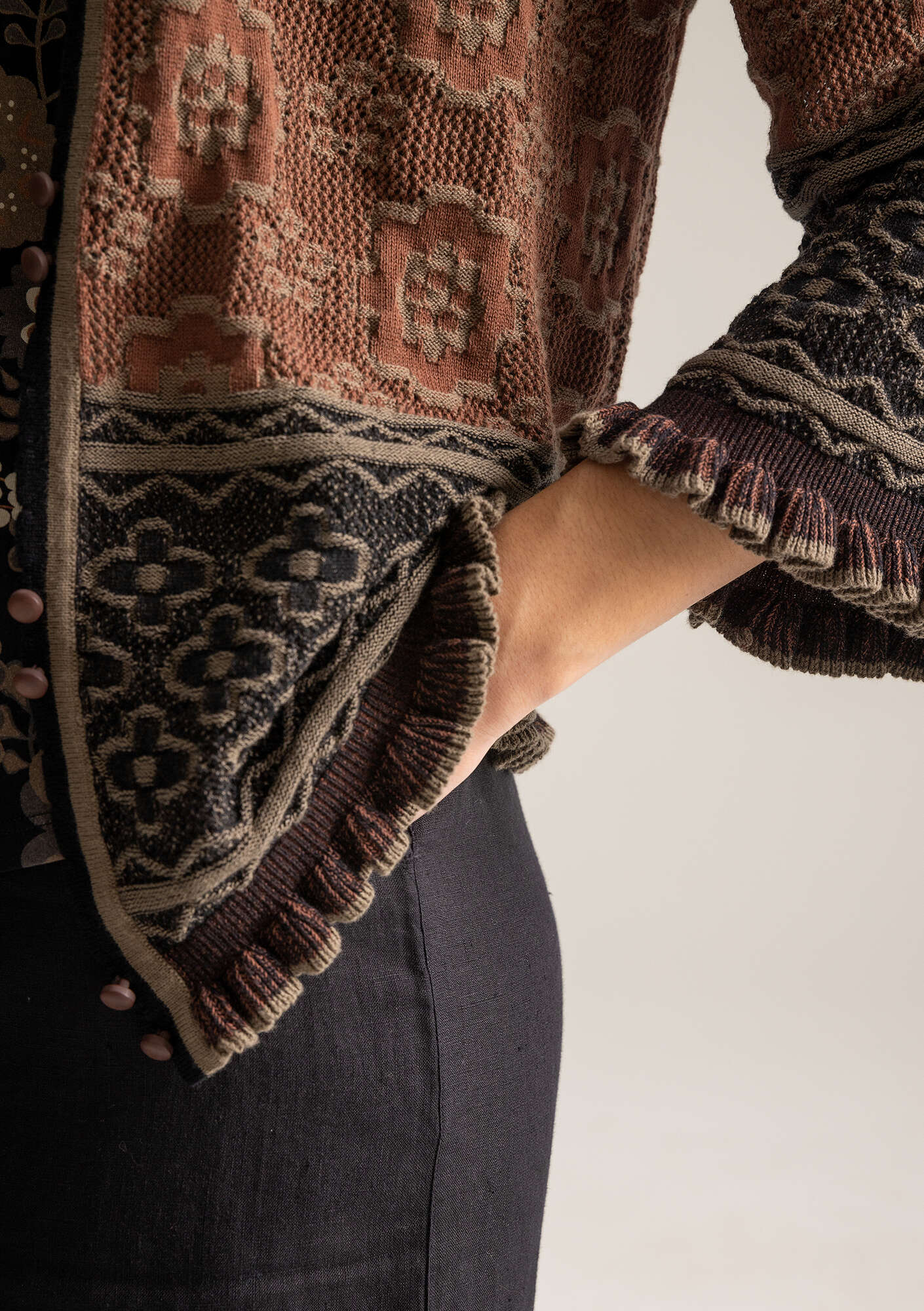 • Plaited cardigan knitted with a pointelle pattern. Featuring a scoop neckline, three-quarter flared sleeves and a frilled finish on the hem and cuffs. Scallop trims around the collar and button closure. Frosted buttons made of a recycled material.