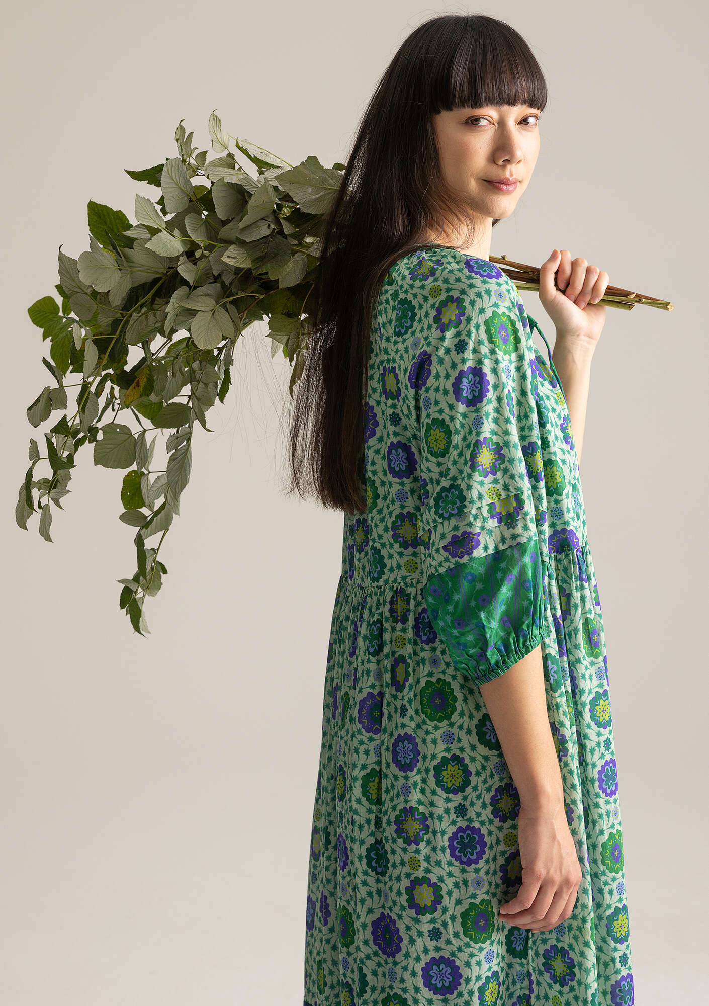 Seamed-waist dress with a button-through front, side pockets, embroidered trim and a printed design. Softly puffed, three-quarter raglan sleeves finished with an elasticated cuff. Round neck with a tie detail and fabric-covered buttons.