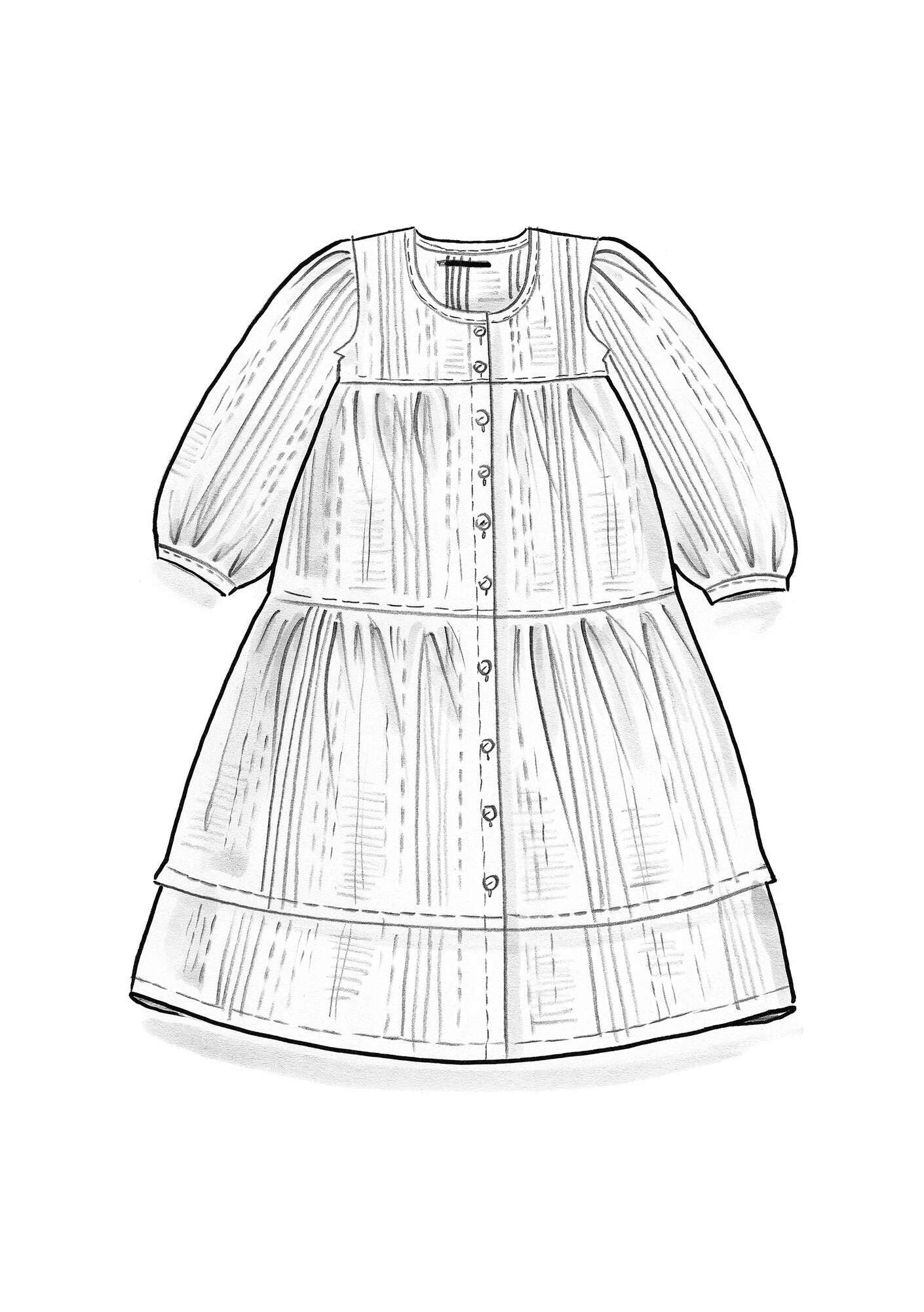 • Dress with front and back yoke. The fabric is gathered at the top of each tier to create pretty volume through the skirt. Button-through style. Three-quarter puff sleeves. Pleat stitched in the hem of the skirt.