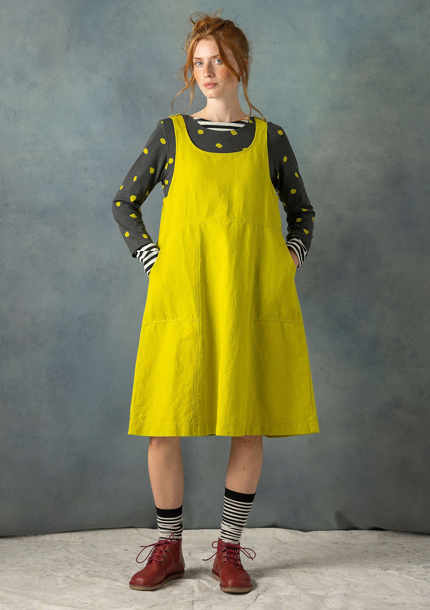 Cut from a comfortable cotton and linen blend slub weave fabric. Featuring adjustable shoulder straps, decorative seams and metallic trim. The skirt flares out from the waist seam and has classic workwear patch pockets.