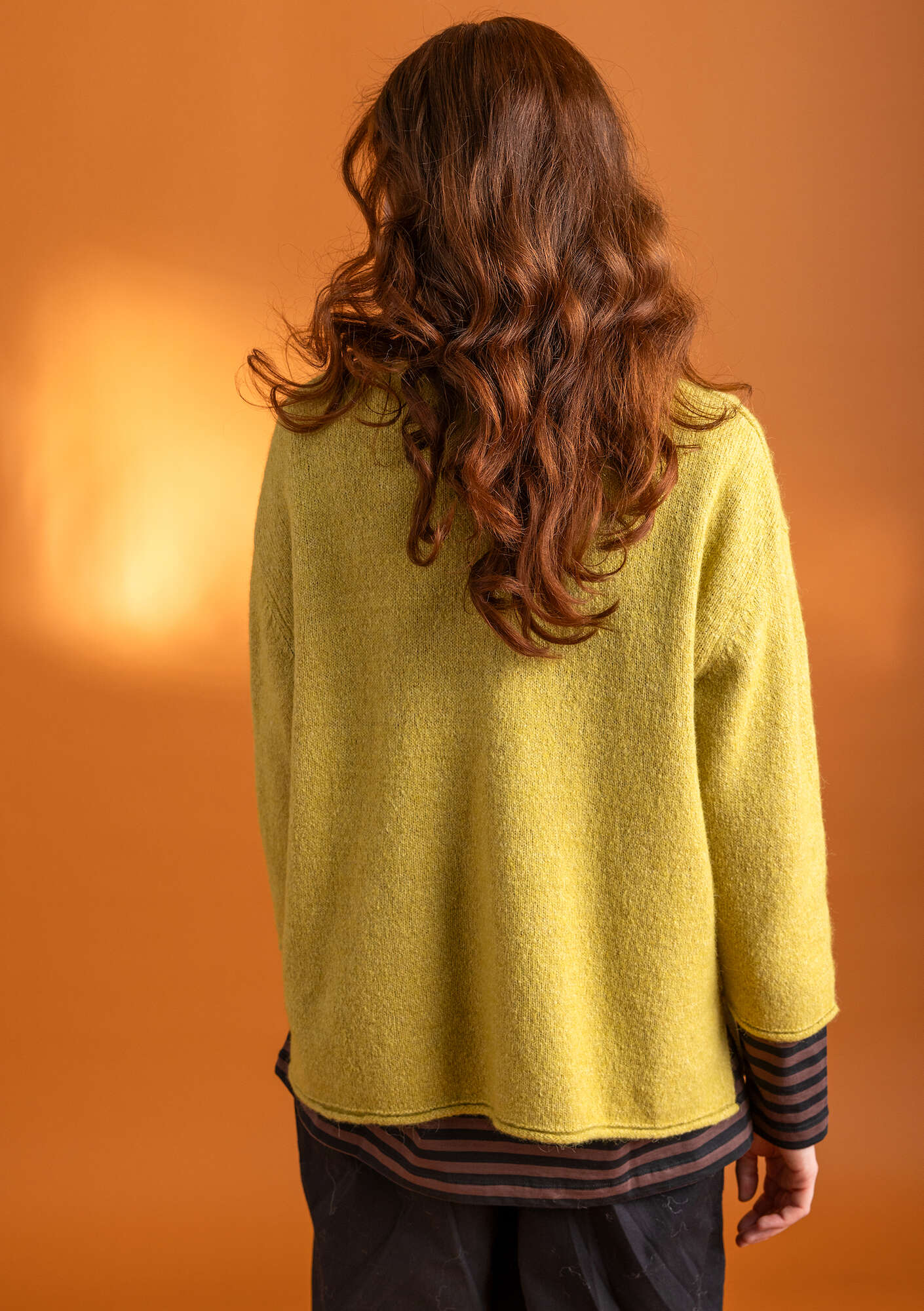 - V-neck sweater in a slightly more relaxed fit, for cozy days. Knit in our lovely variegated yarn, with small side slits. The cuffs and hem are finished with a little rolled edge.