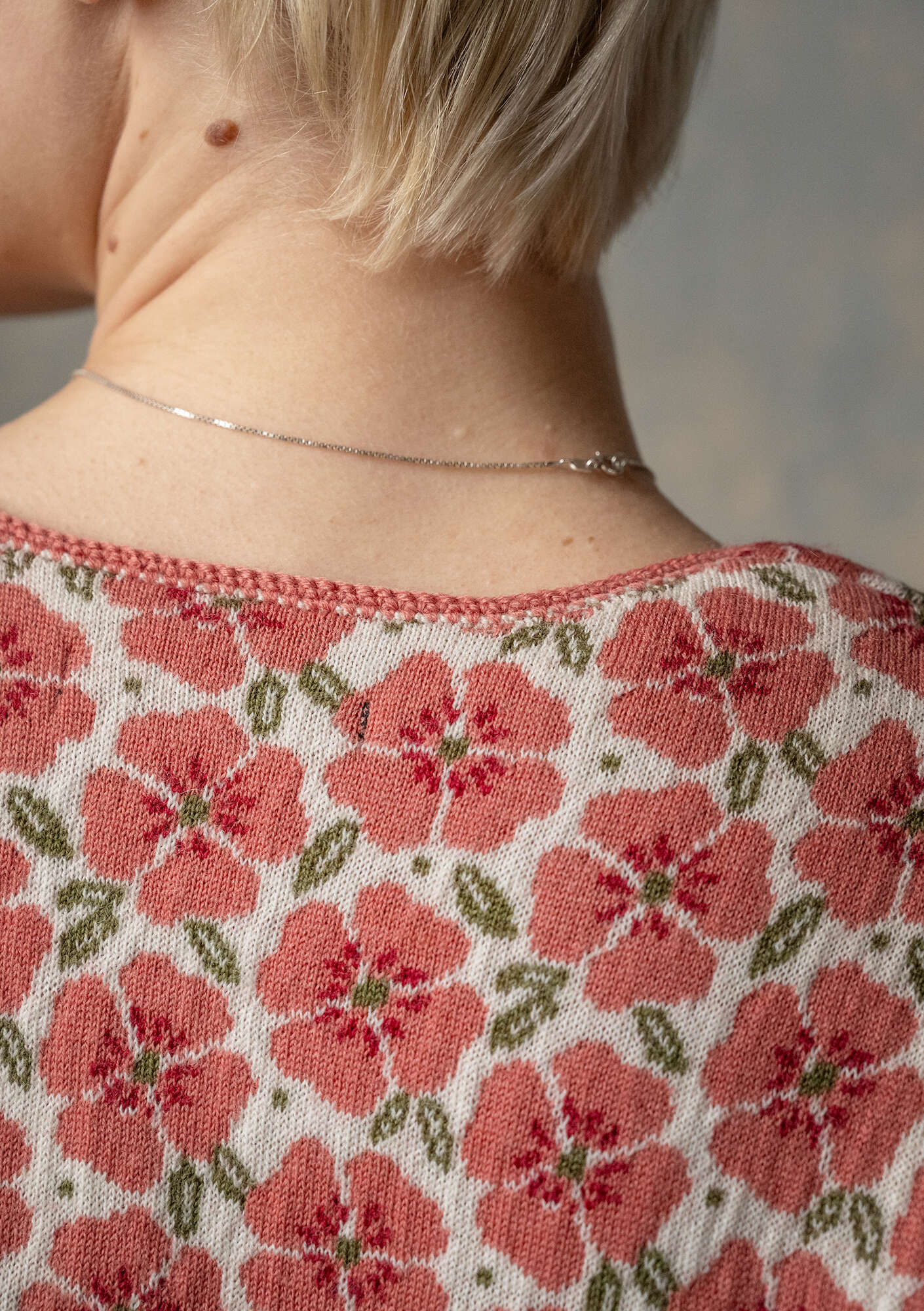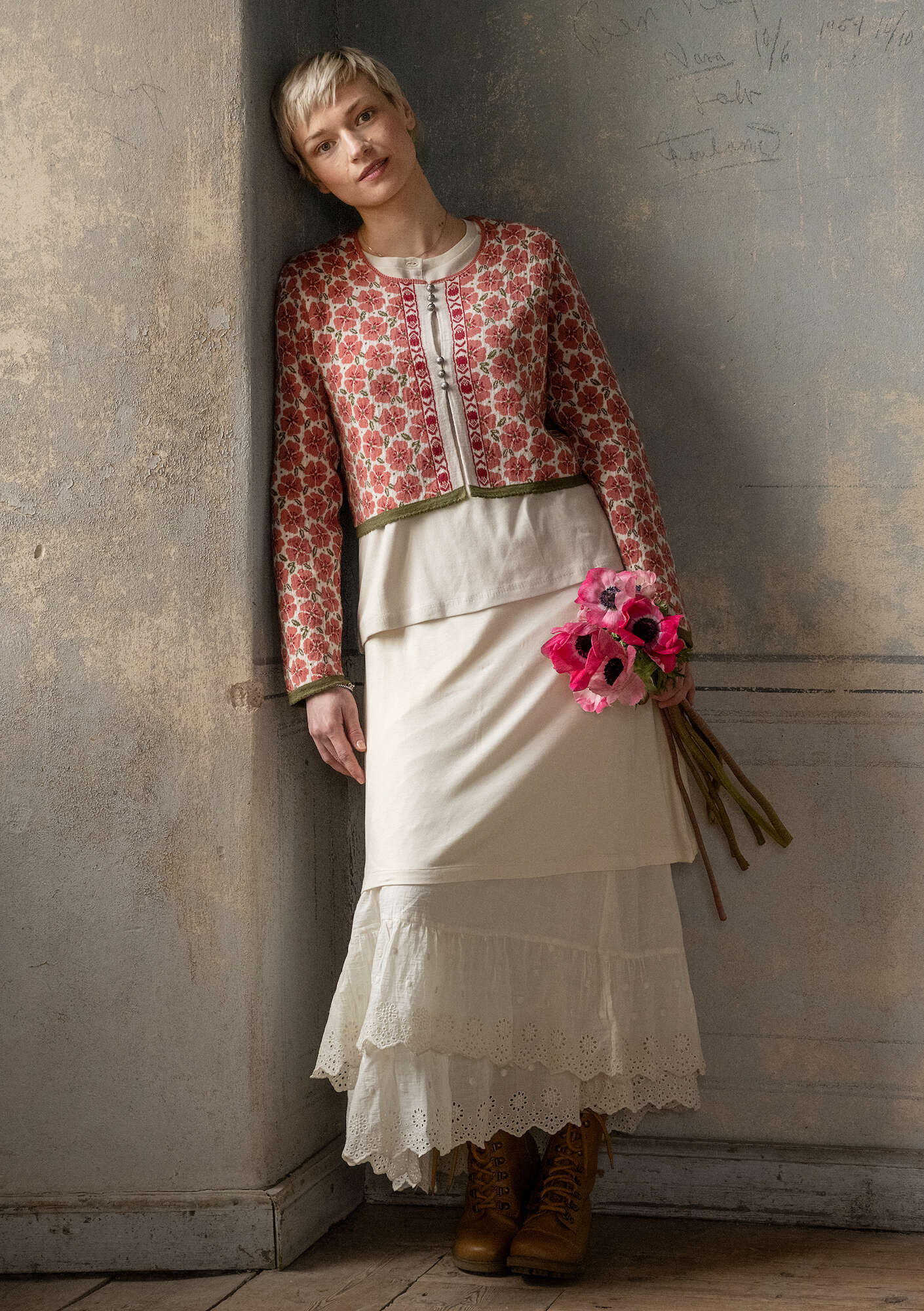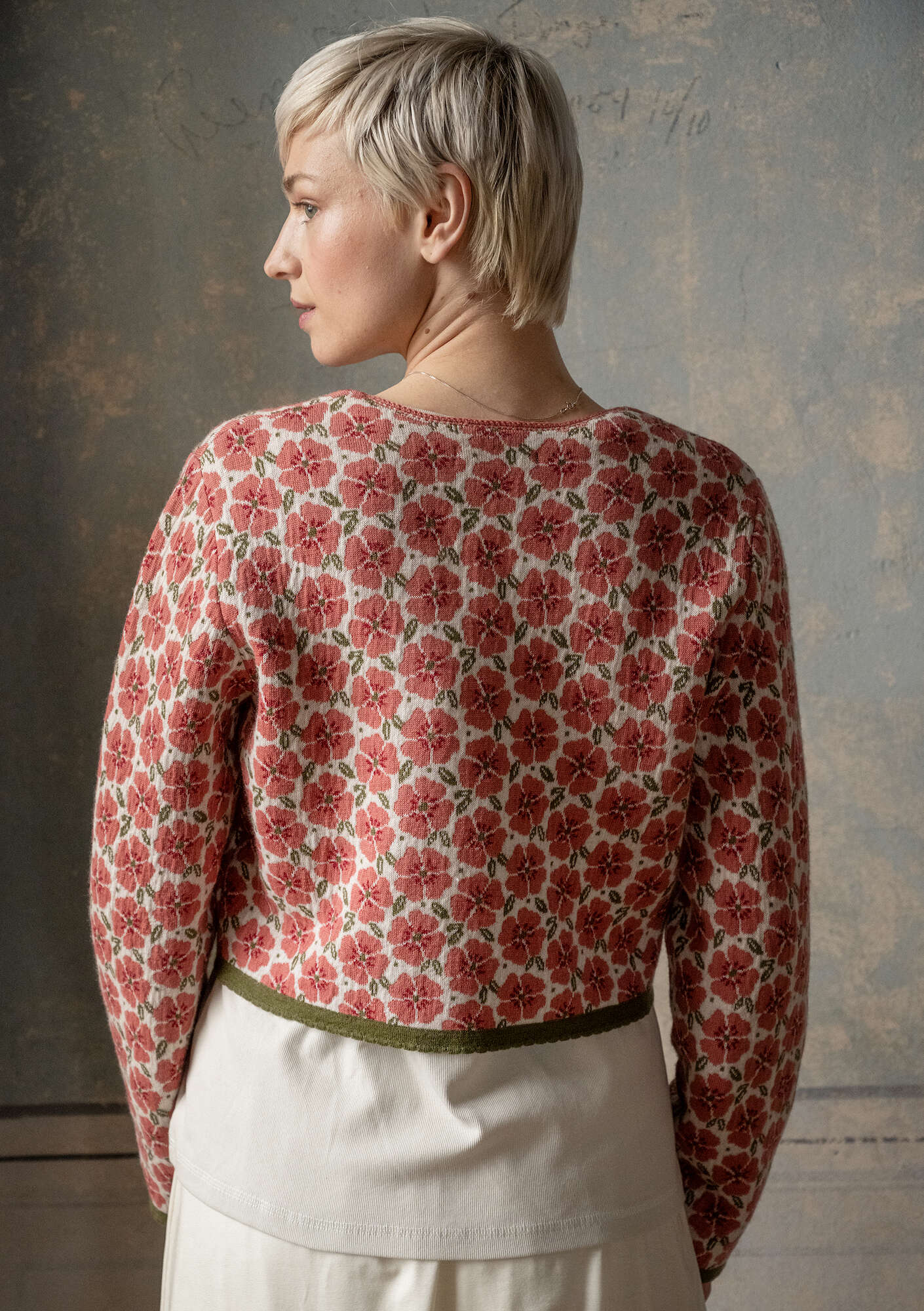 - Jacquard cardigan knitted in soft merino wool. Design inspired by traditional folk costumes with full-length sleeves and contrast knitted edges. Hand-crochet finish around the scoop neckline. Beautiful floral pattern with decorative borders. Fastens with round, ornamental buttons and crochet loops.