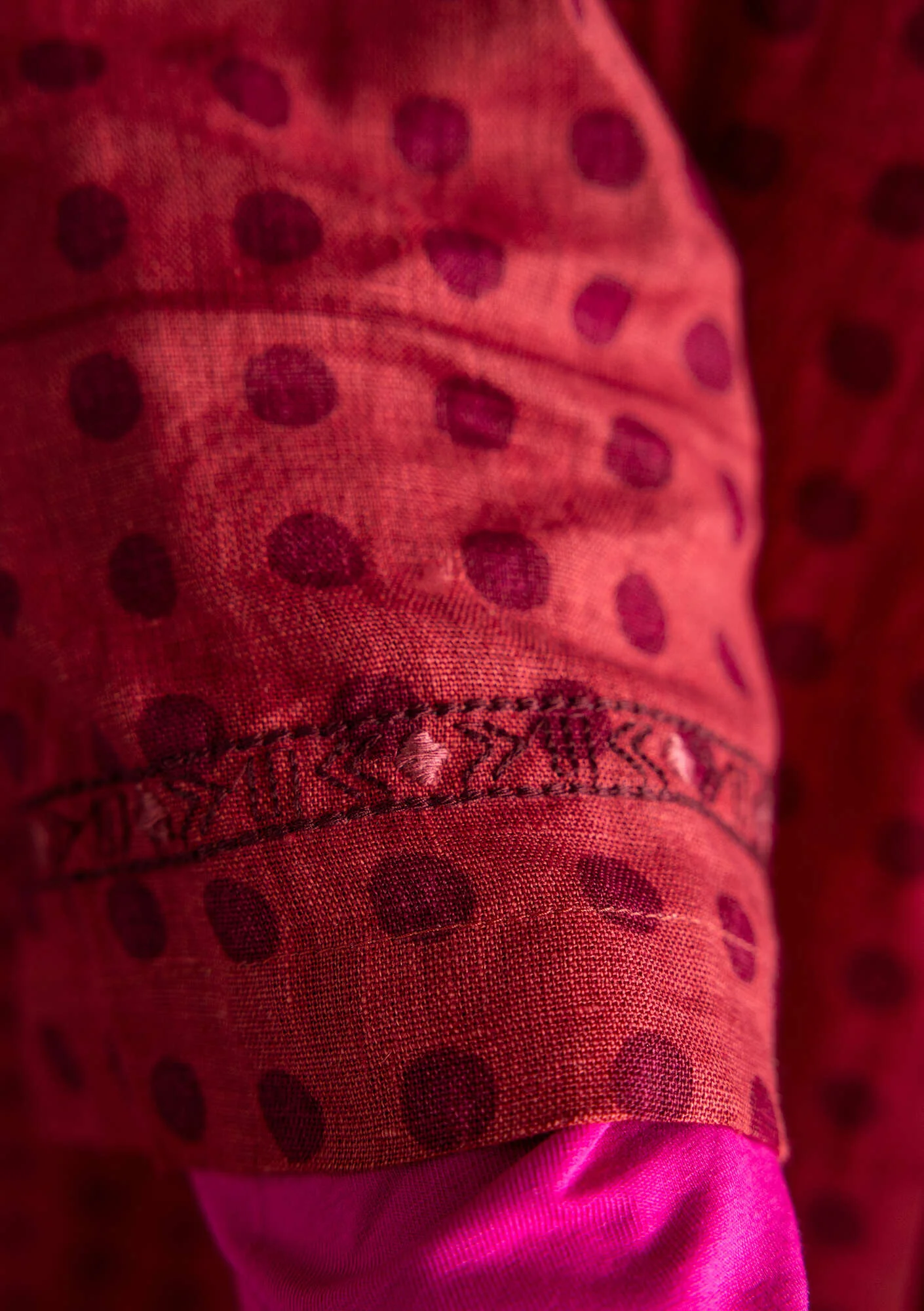 - Front and back V-yoke. Front button detailing and a small pleat for extra width. Three-quarter-length sleeves with embroidered detailing on the cuffs. Concealed side pockets.
