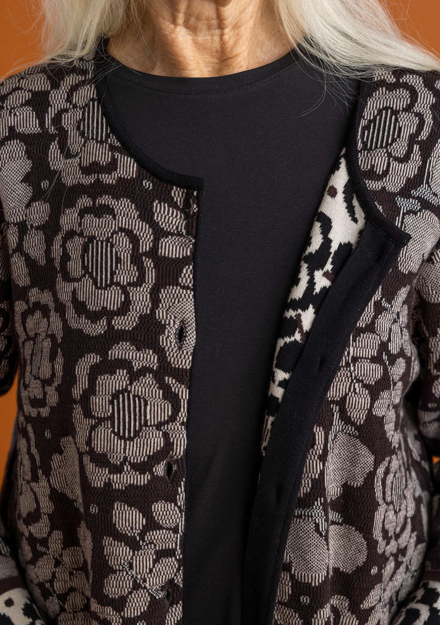 - Jacquard-knit with full-length sleeves. This subtle design almost seems solid-colored, but has a hint of a rose pattern. Practical pockets in front.