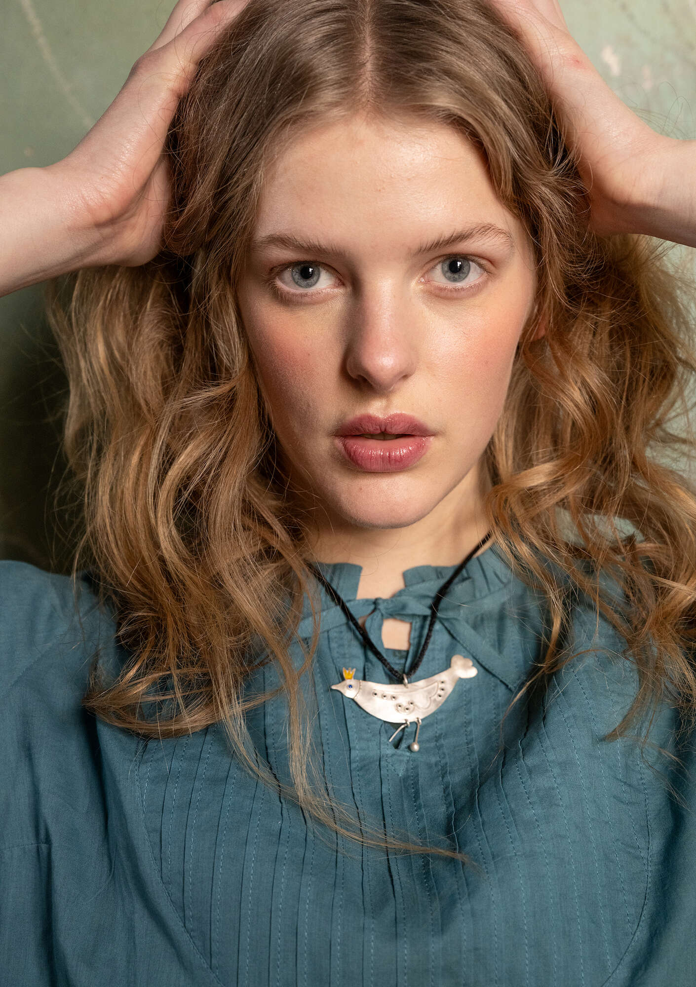 • Solid-colored blouse with full-length sleeves. Beautifully detailed with pintucks at the top and a decorative pleated collar with ties. A tone-on-tone embroidered border with English hemstitching at the hem and cuffs.