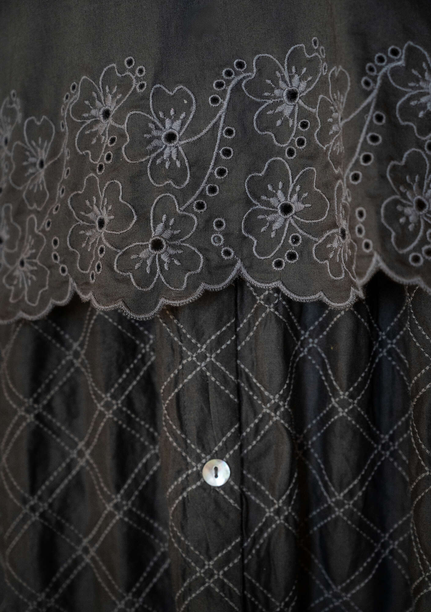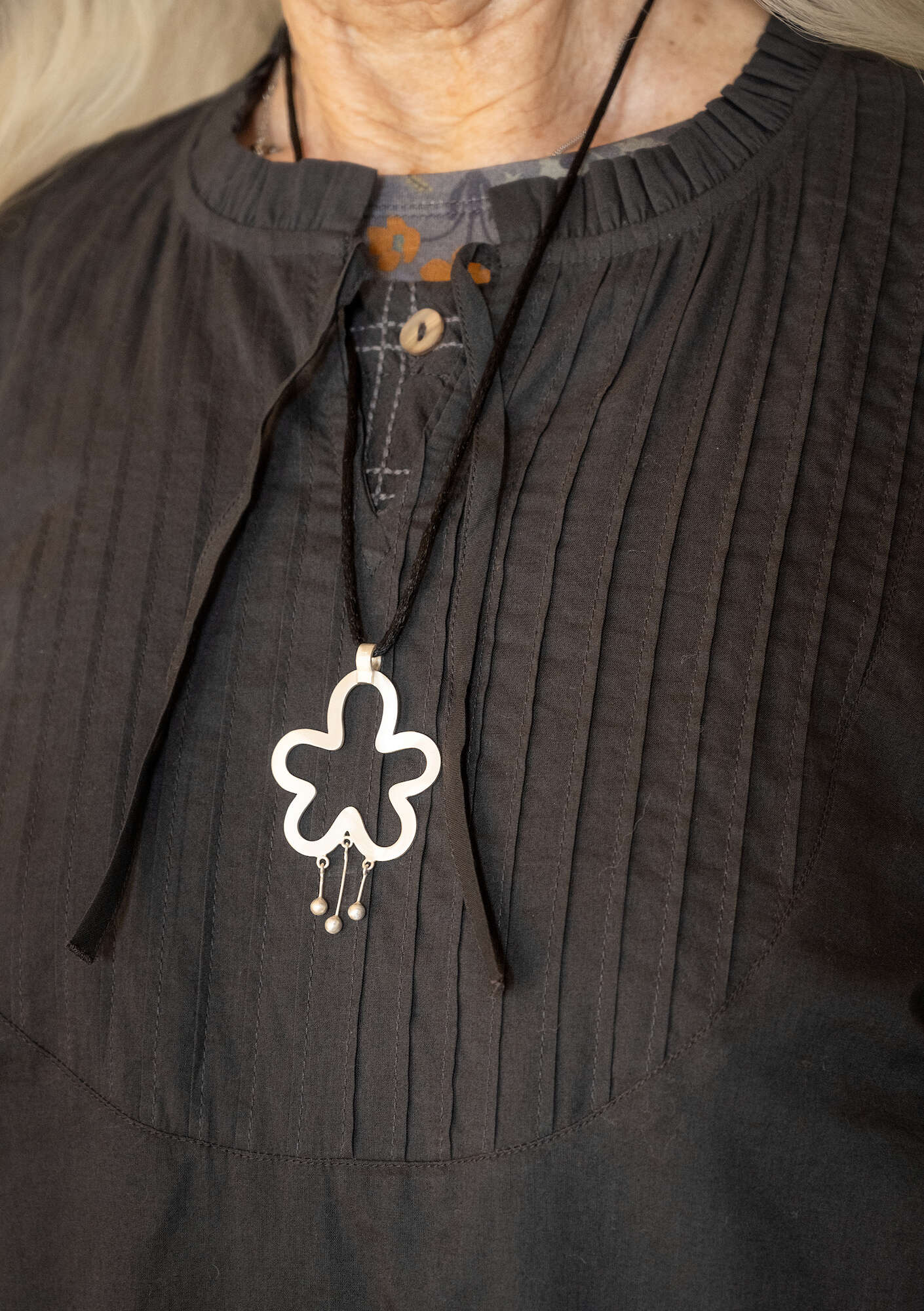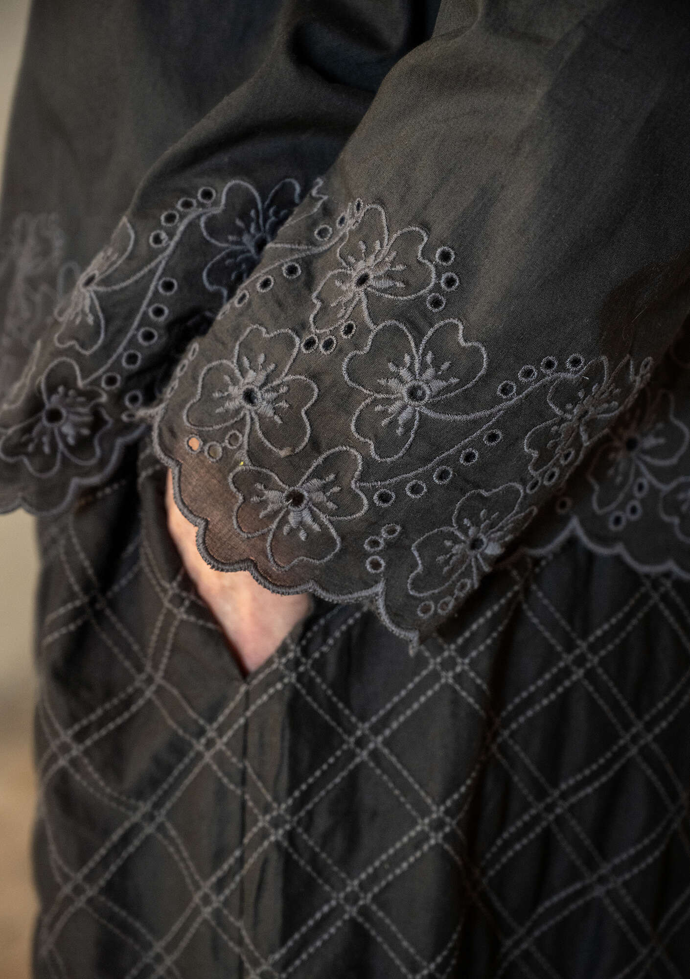 - Solid-colour blouse with full-length sleeves. Finely crafted with pintucks below the neck and a decorative ruffle collar with a ribbon tie. The hem and cuffs feature tone-on-tone embroidered openwork.