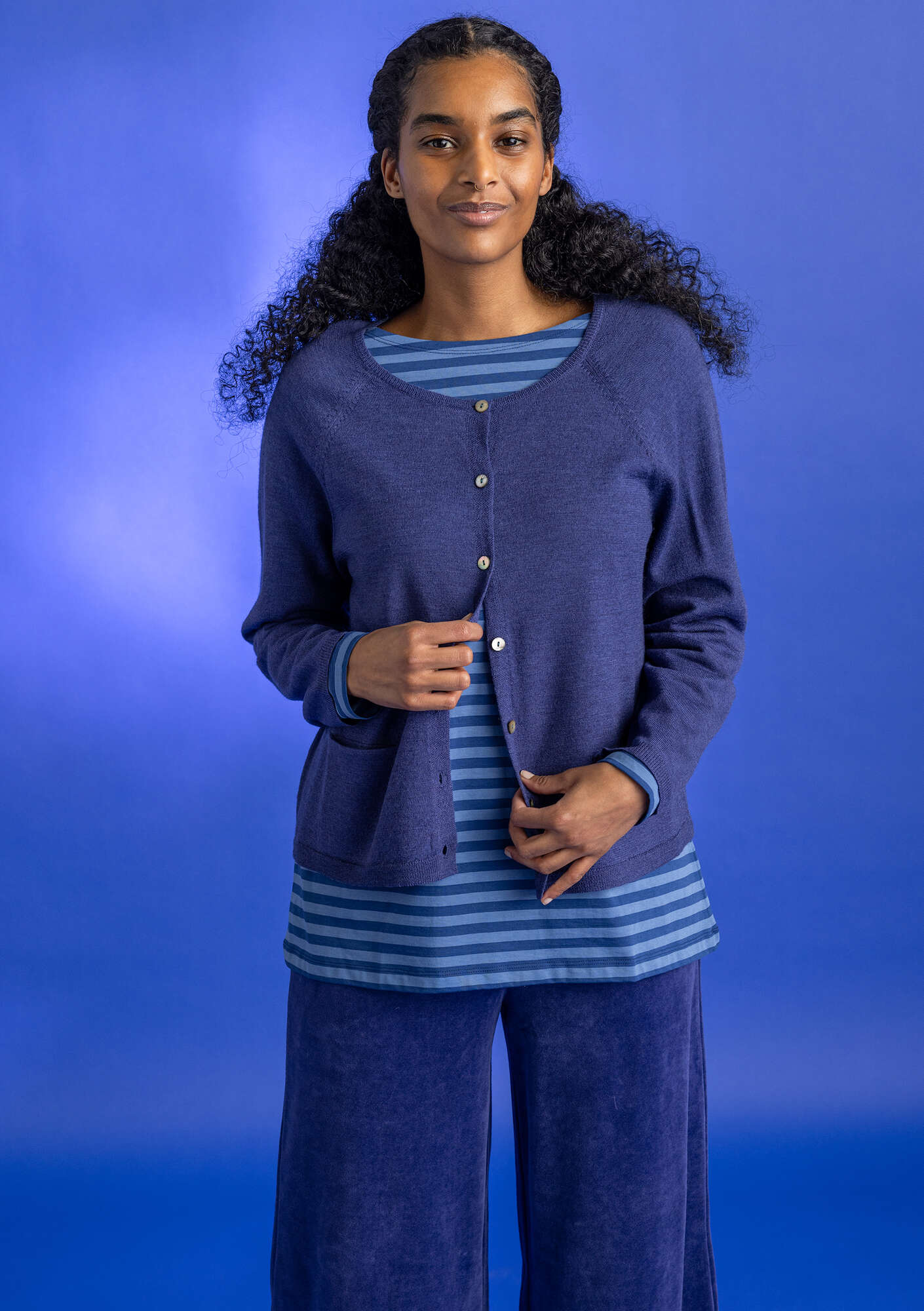- Slightly shorter style with full-length raglan sleeves. Pretty ribbing at the neckline, cuffs and hem. A practical pocket and lovely mother-of-pearl buttons.