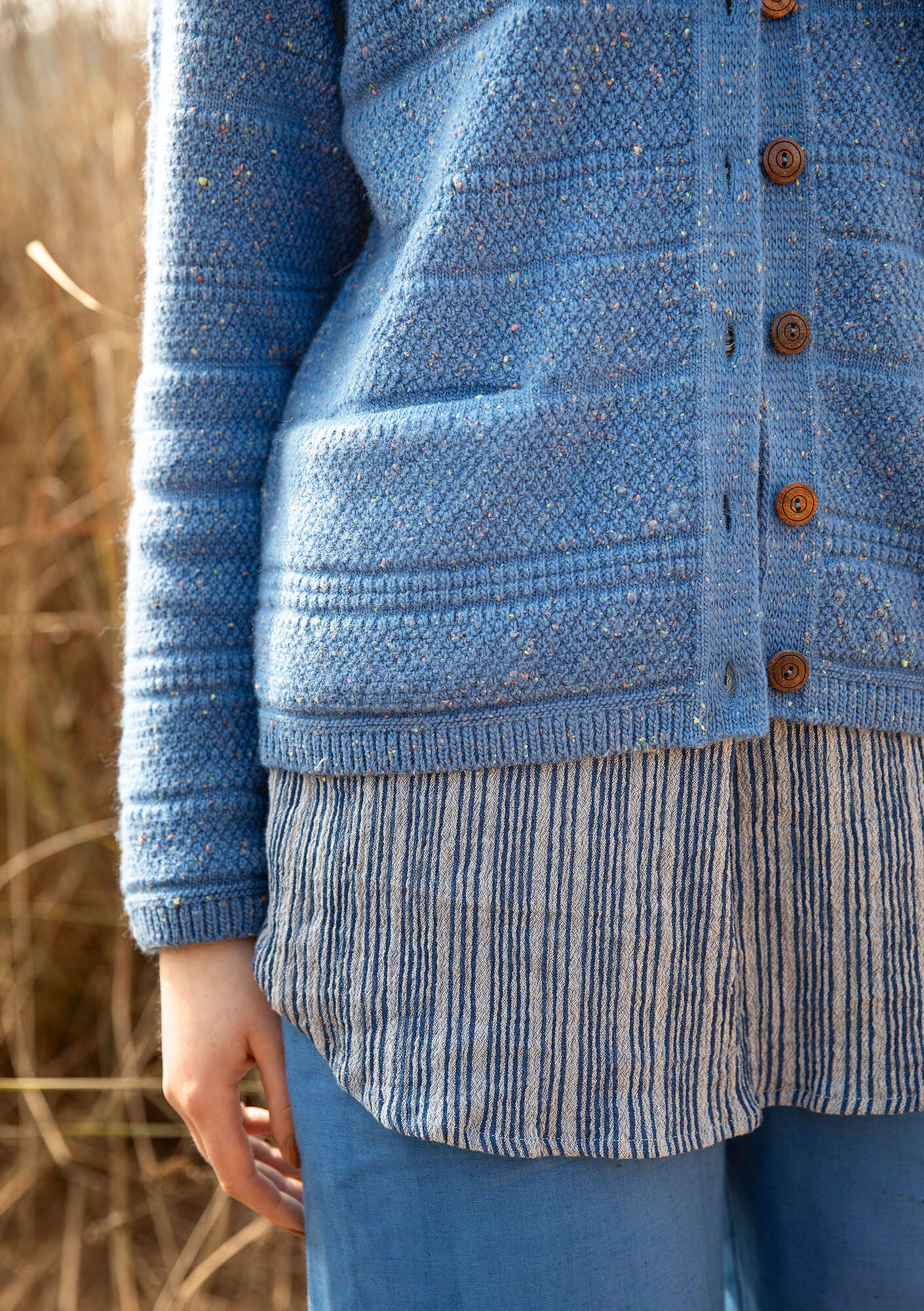 - Textured knit cardigan with a cozy, luscious feel. The yarn is of our own design, with tufts in cheerful colors. This style has two inset front pockets, full-length sleeves, a round neck and ribbed finishes. Closes with natural-color wooden buttons.