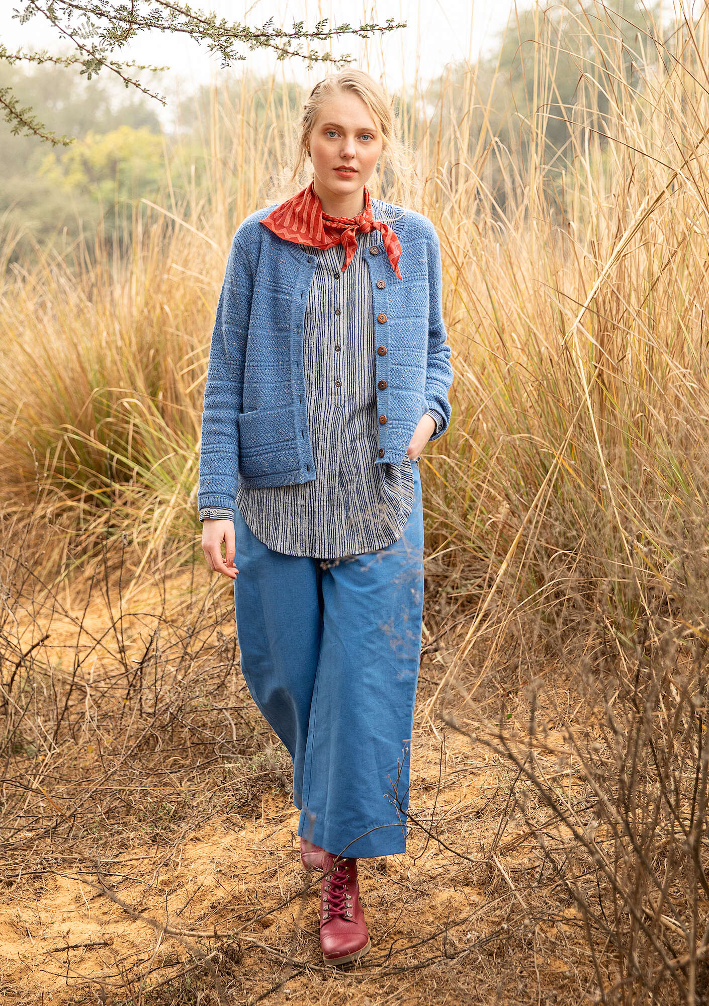 - 98% wool/2% silk. The wool is mulesing-free. Even the finest wool may be subject to some pilling after repeated wear. Carefully remove any pilling. We suggest airing this garment or steaming with an iron. As a last option, hand wash cold or wash in the washing machine set to the wool-wash cycle. Use wool detergent. Gently reshape while damp. Dry flat. Shrinkage 4-5%. Made in Ludhiana, India.