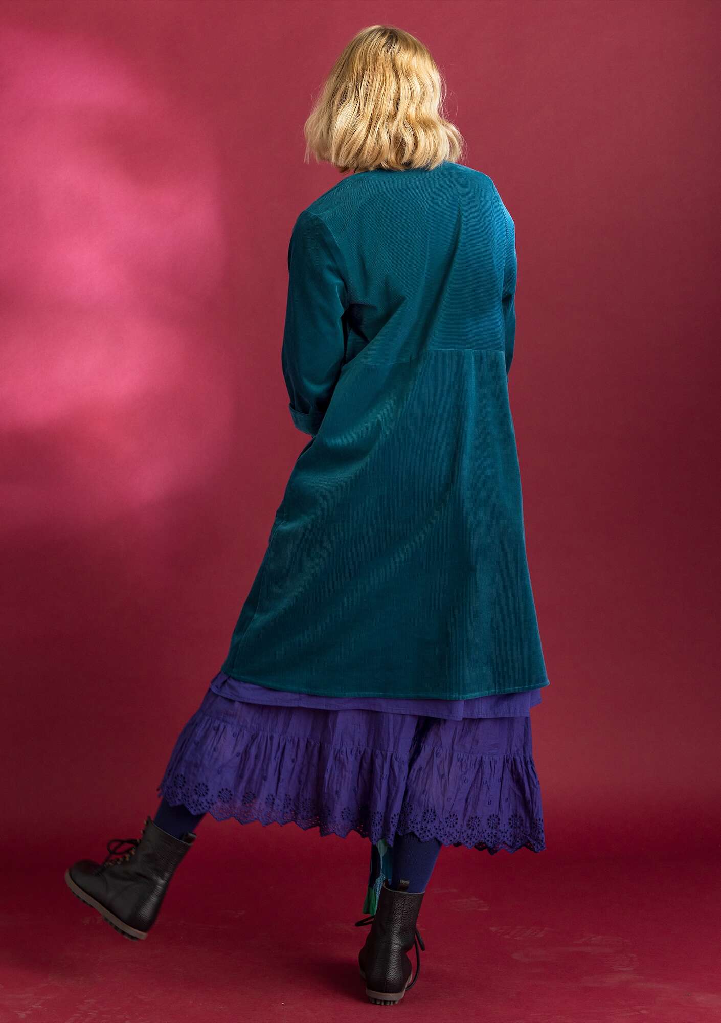 - Fully buttoned dress with three-quarter sleeves. Practical side pockets and dyed buttons in recycled nylon. Wear as a dress or as a lighter coat.