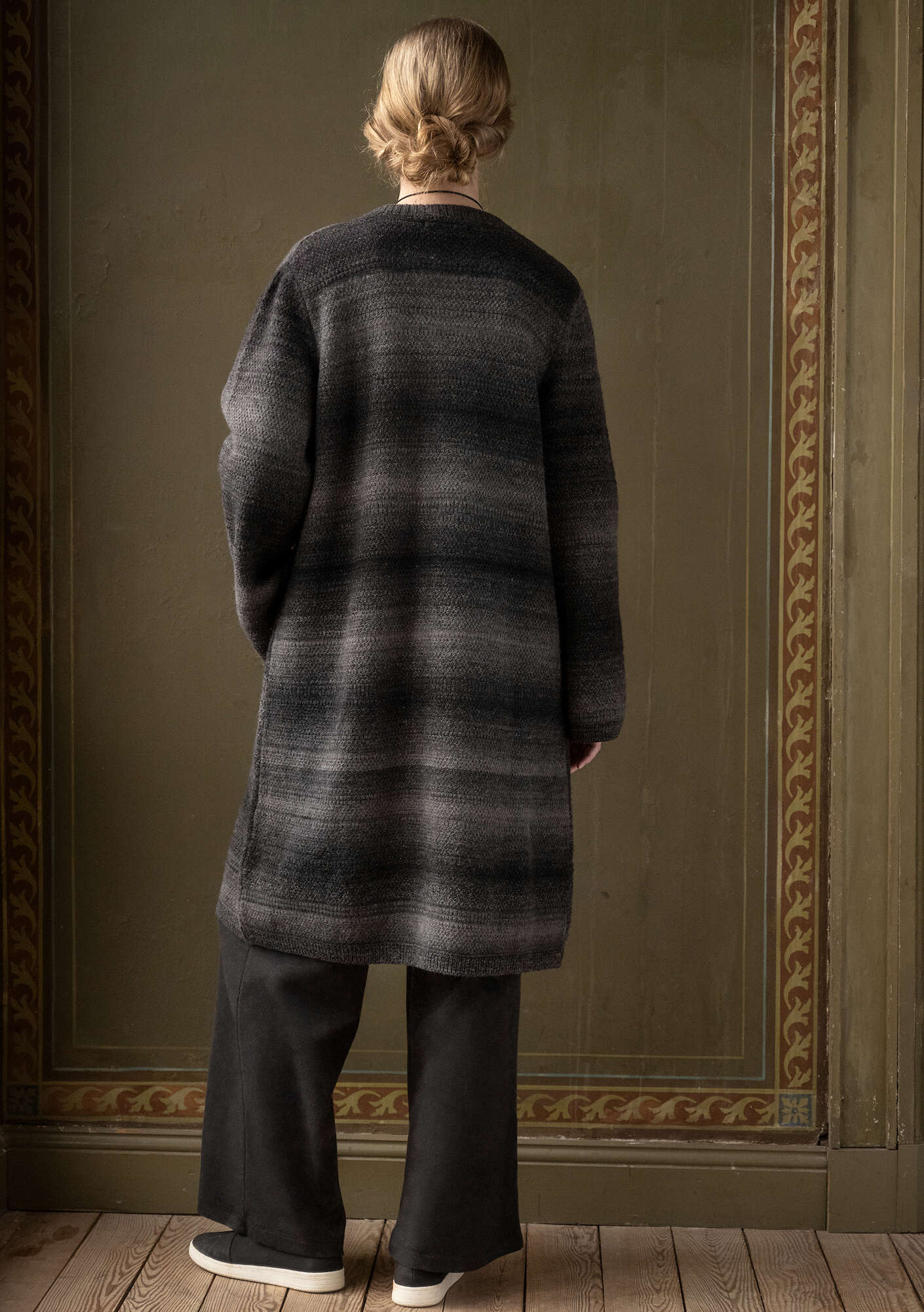 • Textured knit cardigan made with a unique and striking house-designed yarn that is irregularly dyed. As a result, each cardigan is unique, with stripes that vary from garment to garment. This style has patch pockets, full-length sleeves, a round neckline and ribbed finishes. Decorative buttons in natural-colored wood.
