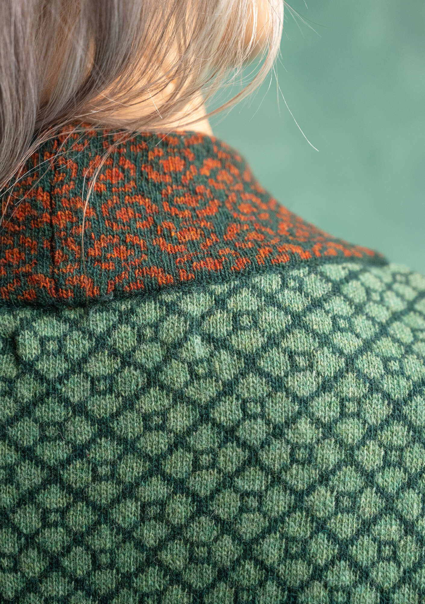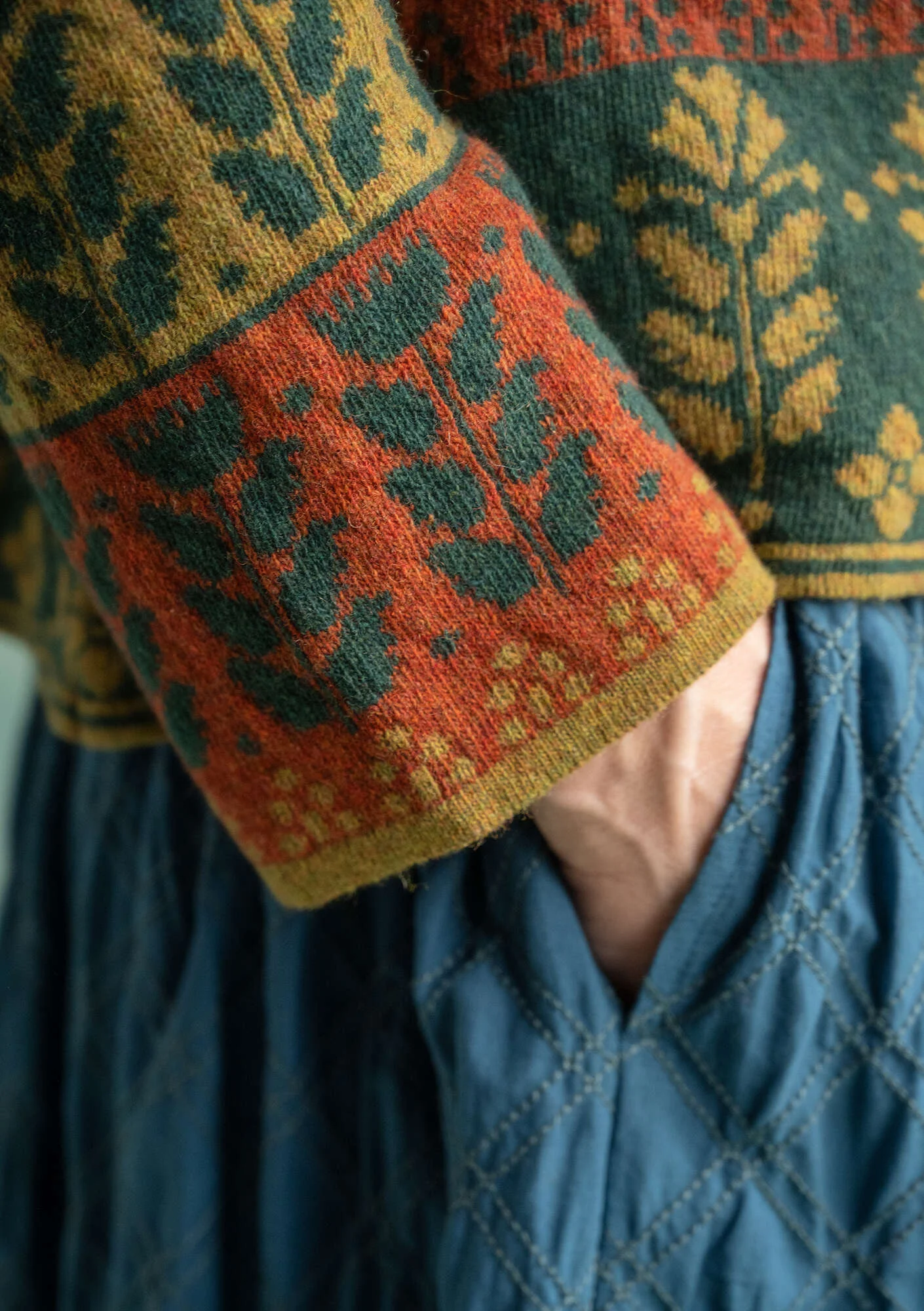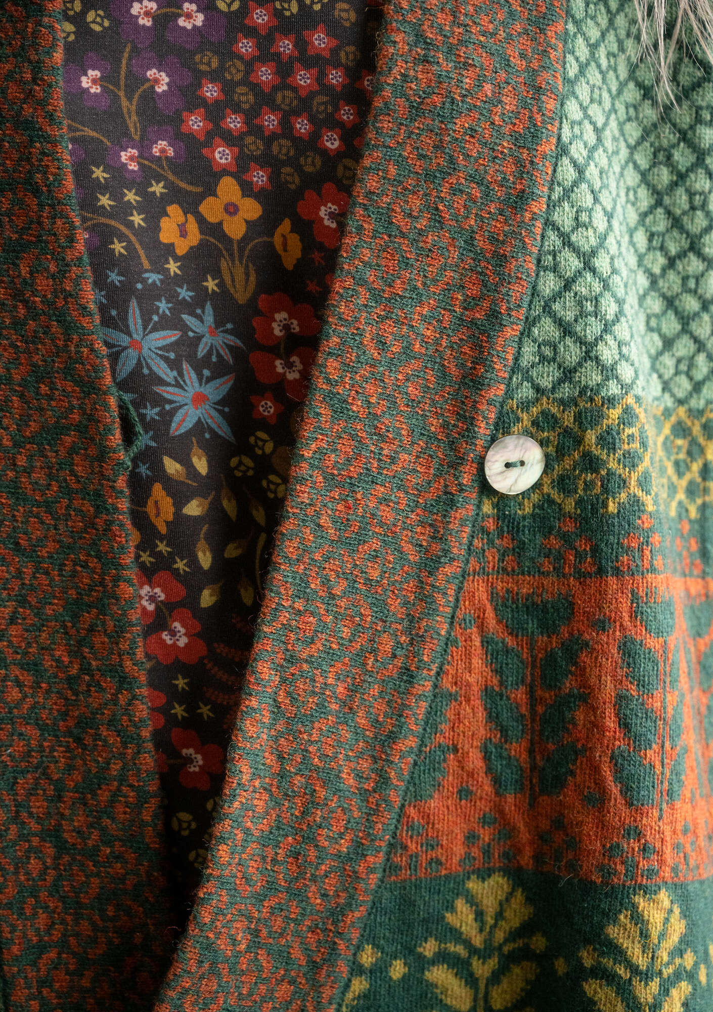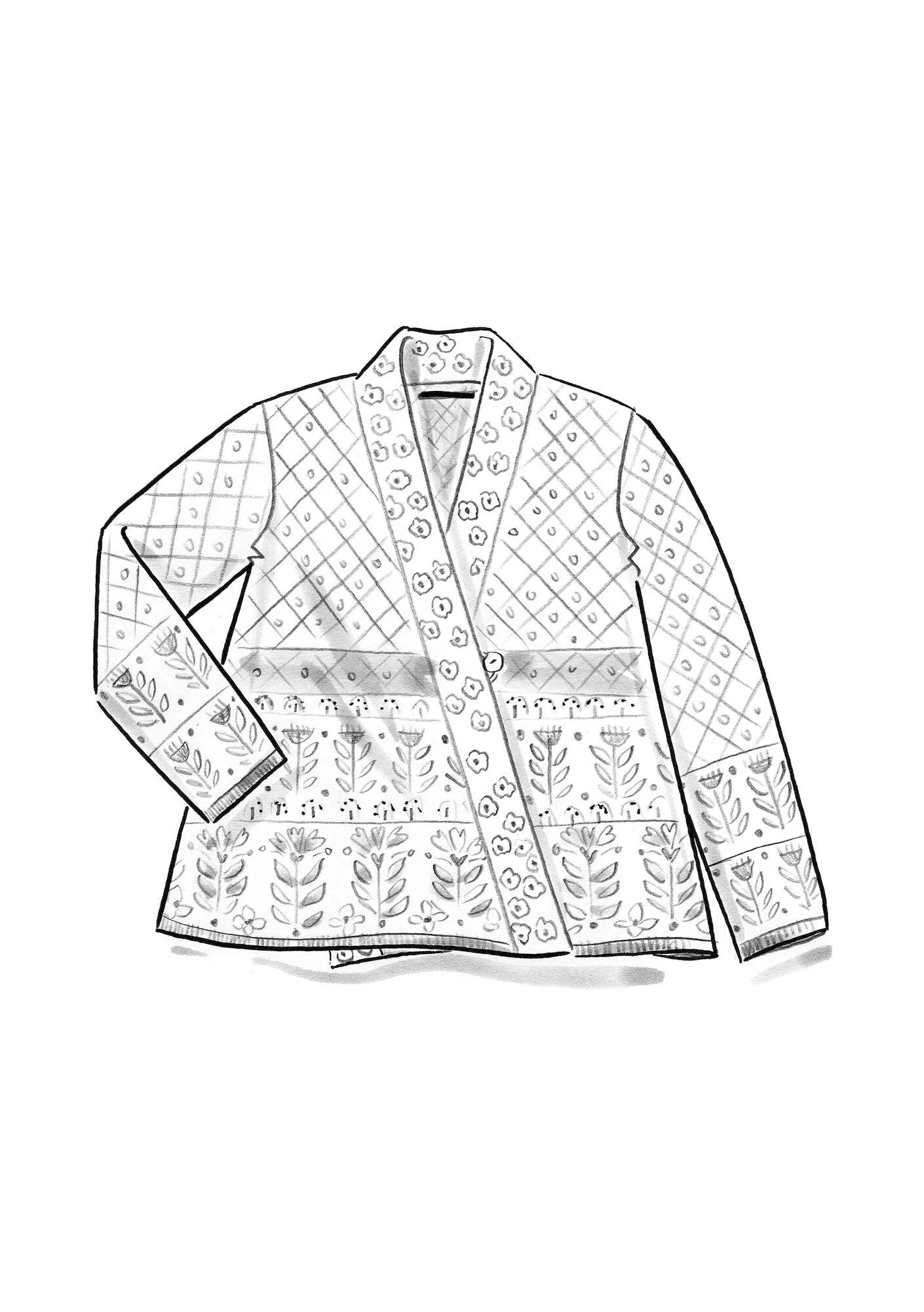 - Jacquard wrap cardigan with full-length sleeves. Beautifully finished with different border designs. One decorative mother-of-pearl button and crochet loop closure.