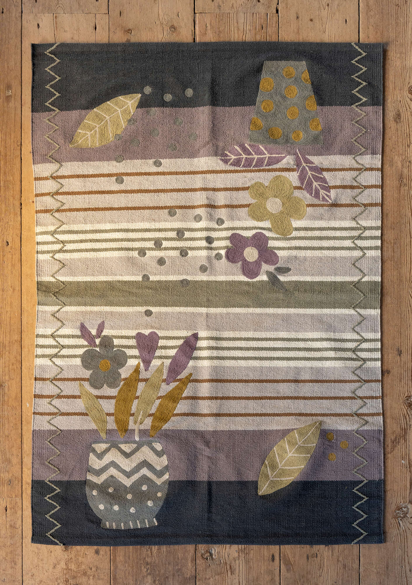 - Organic cotton rug woven with yarn-dyed stripes and decoratively embroidered with flowers in pots.