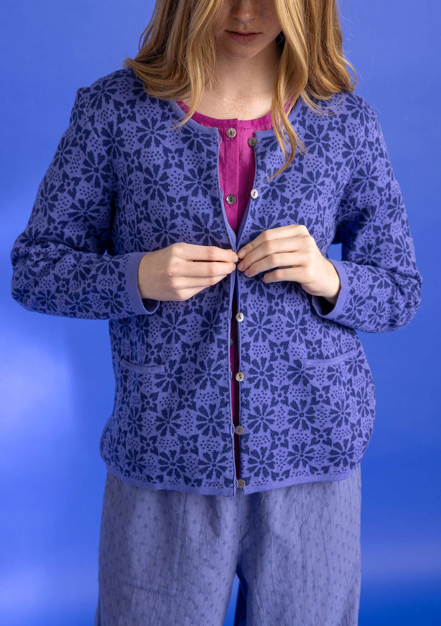 - Jacquard-knit cardigan with full-length sleeves. Graphic floral pattern with a folkloric feel. Mother-of-pearl buttons and crocheted loops in front bring the pattern on the cardigan together in the middle. Two pockets at the front.