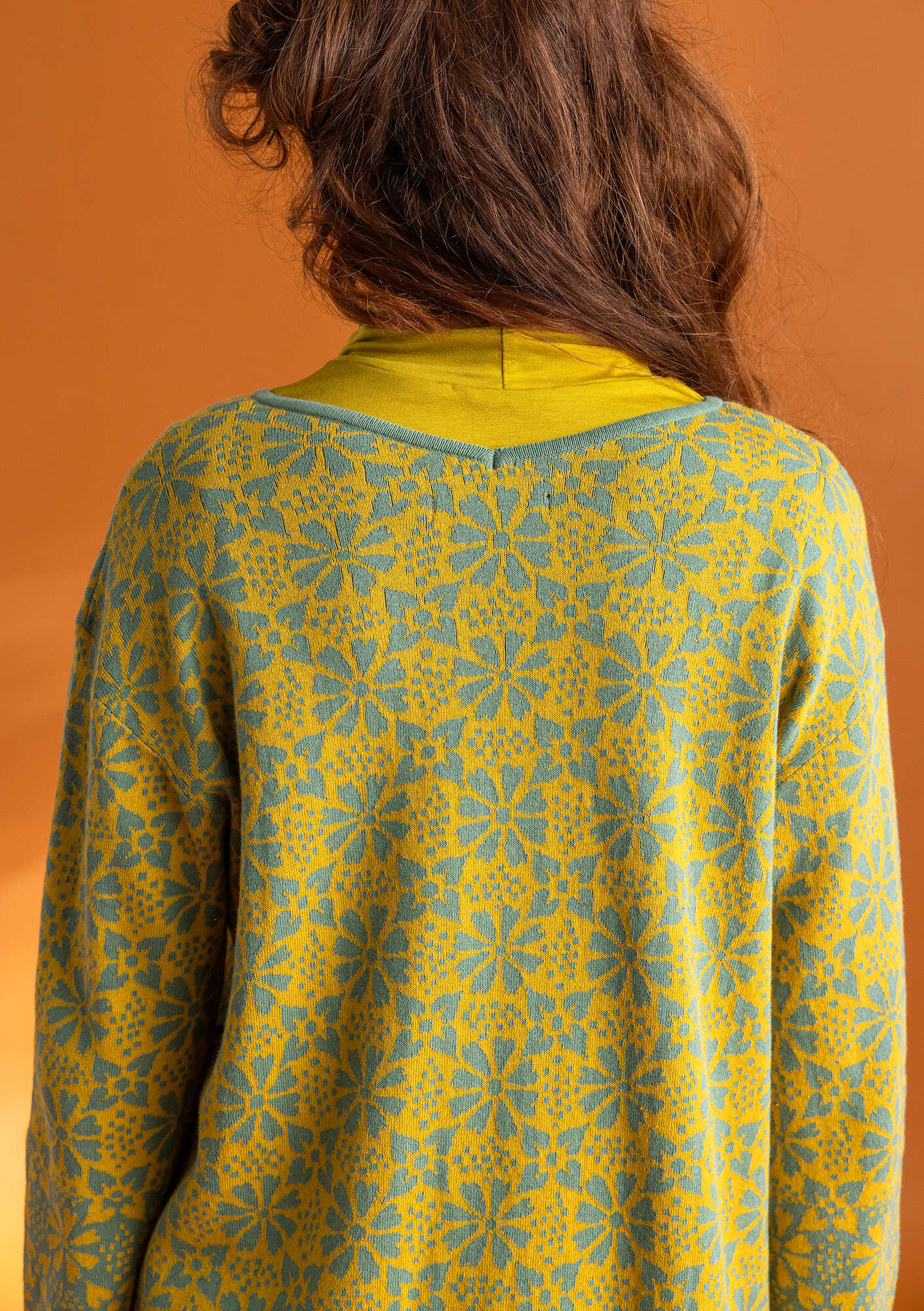 - Jacquard-knit tunic with slightly shorter sleeves. V-neck in front and back. We changed the color placement at the ends of the sleeves, giving the garment a subtle border.