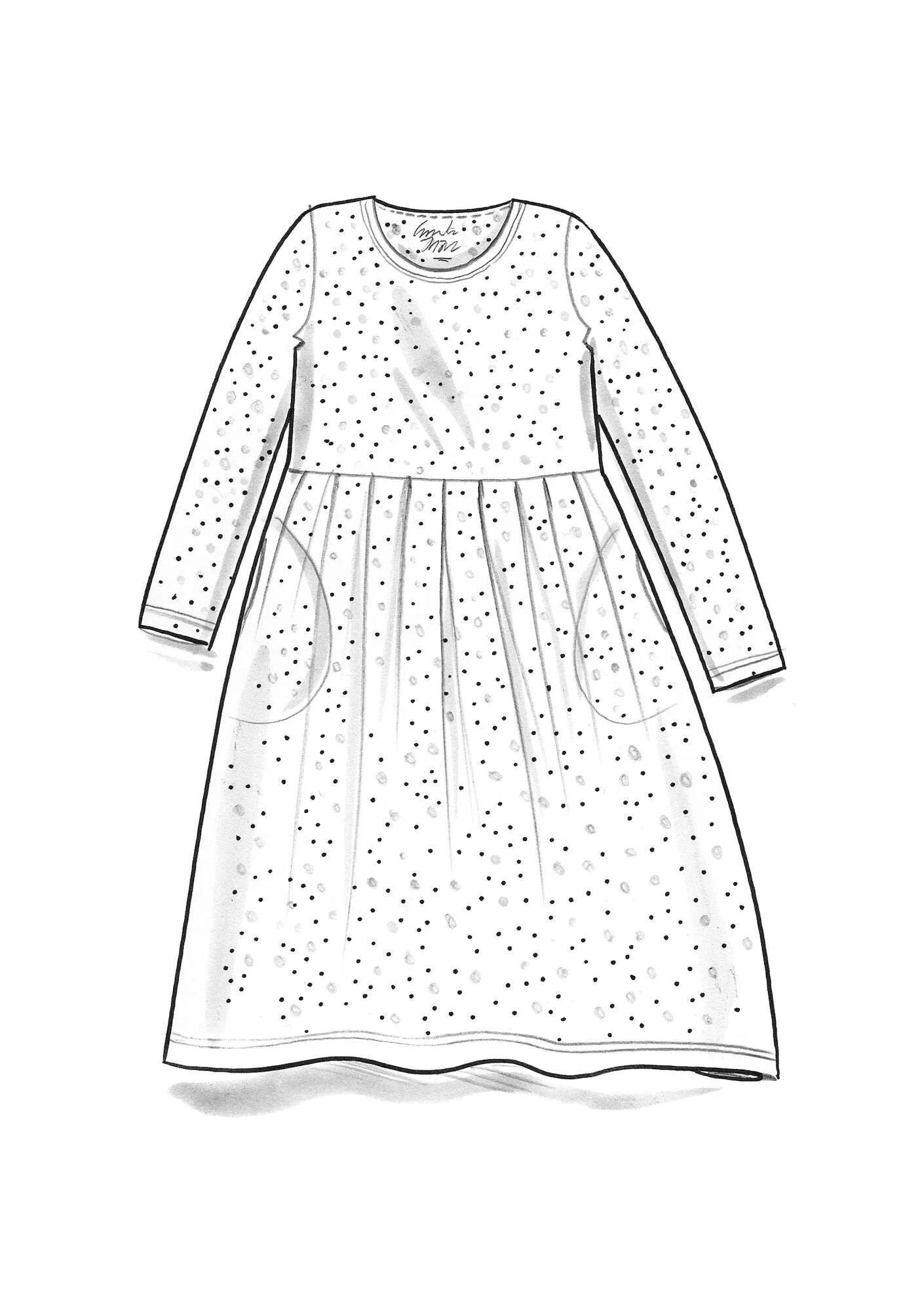 - Printed and solid-colored dress with a round neckline. Closer fit at the top, with a seam at the waist. Pleats all the way around add flattering volume to the skirt. Full-length sleeves and side pockets.