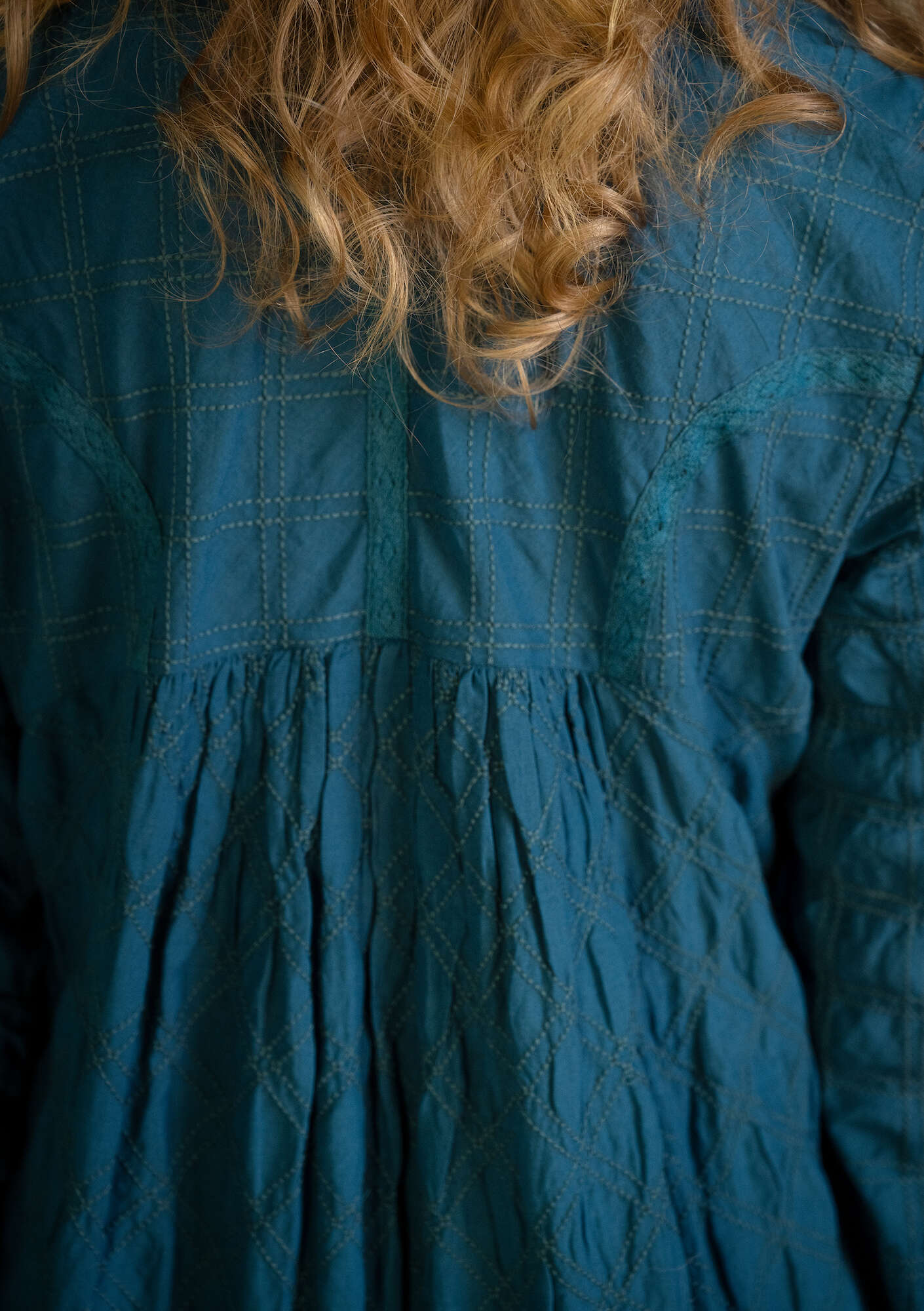 - All-over embroidery. Button-through style. Empire cut with full-length sleeves and mother-of-pearl buttons. Tone-on-tone pattern running in various directions. Seamed waist with a gathered skirt. The cut of the bodice at the back is inspired by traditional folk dresses with lace ribbon appliquu00e9 adding an exquisite detail.