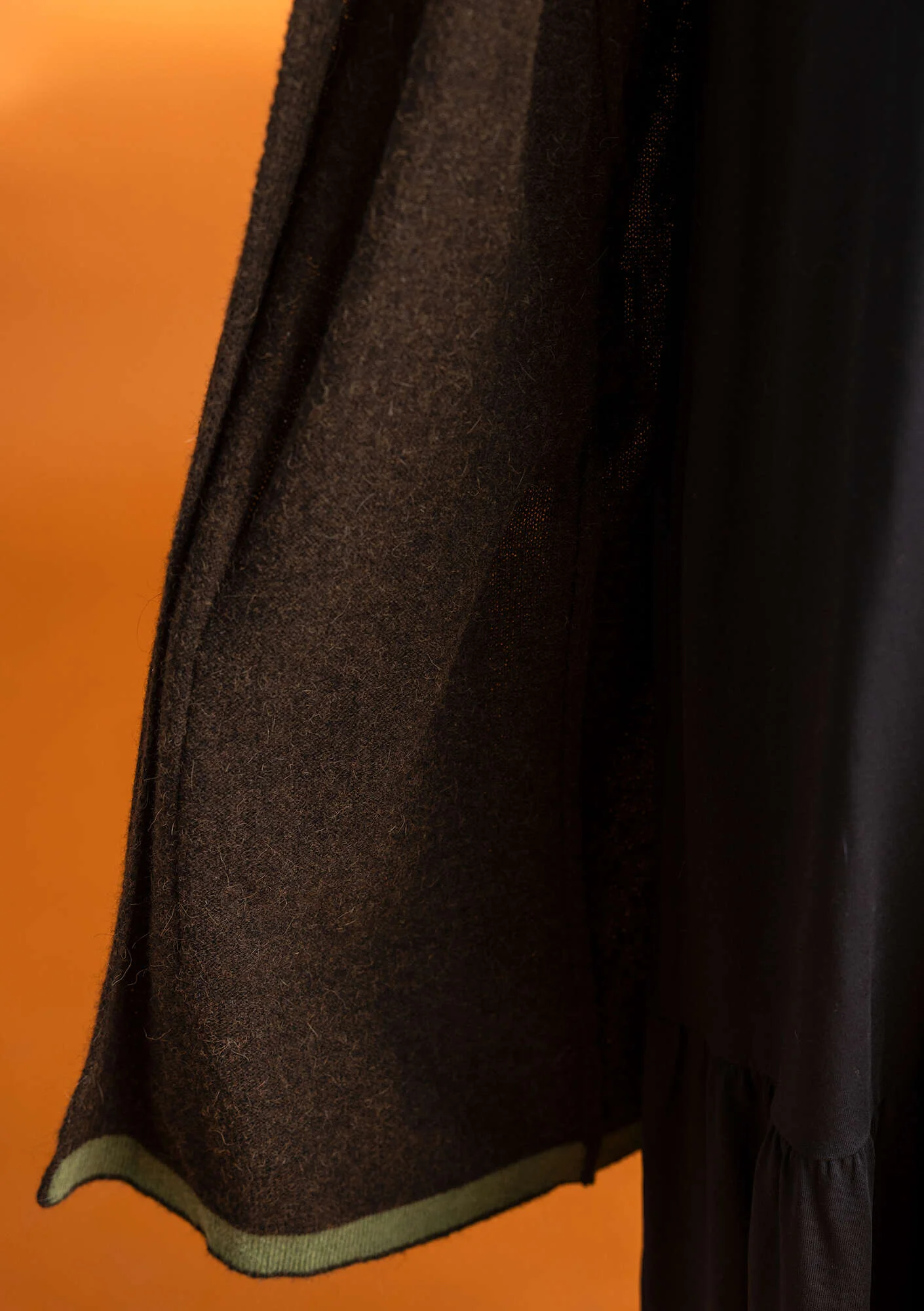 • Longer, cozy and relaxed style with a belted waist. Short, wide raglan sleeves. Patch pockets with a moss-knit texture. Accent-colored details at the neck, and inside the sleeves and lower hem.
