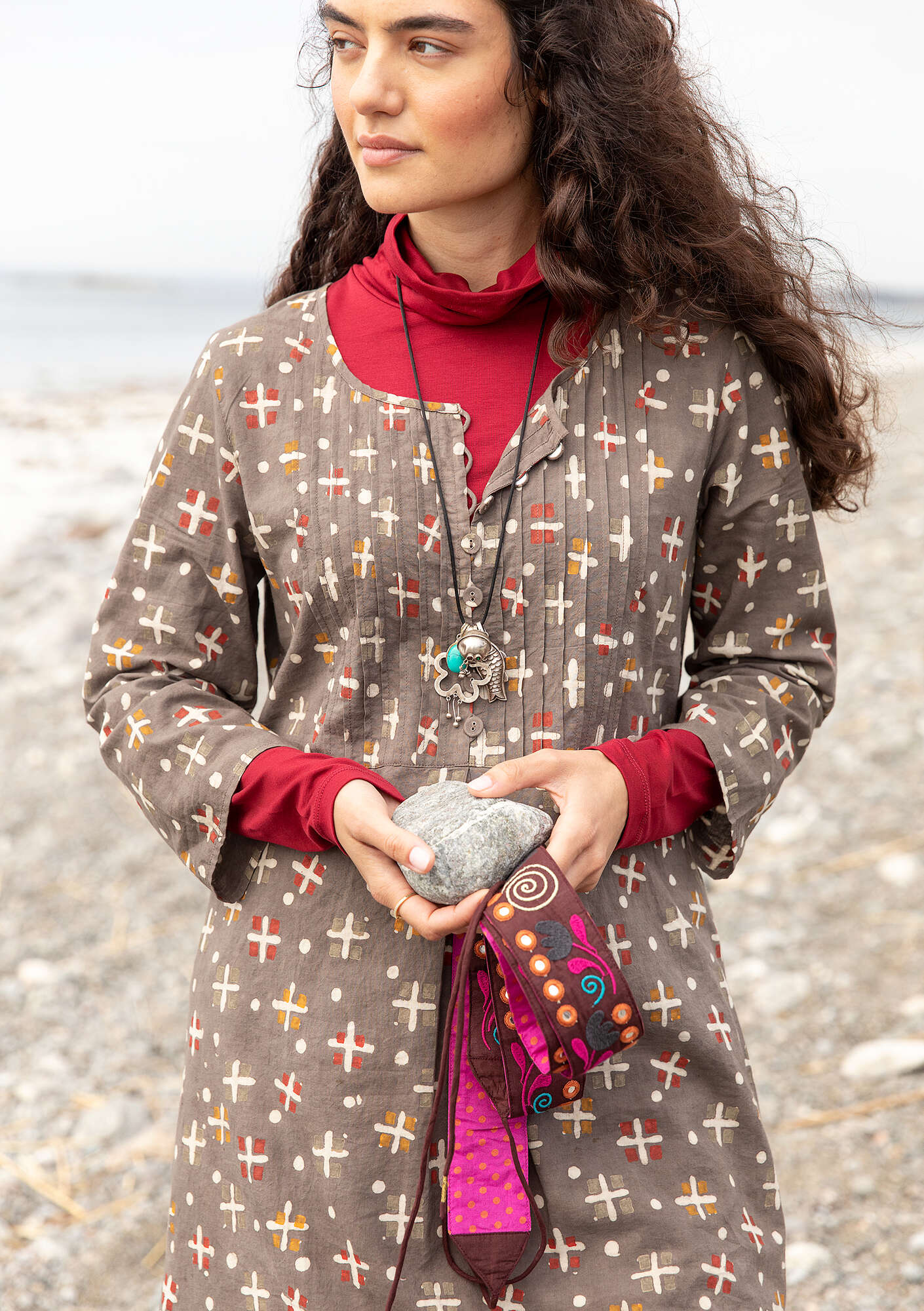 - Dress with a pattern made using block and resist printing, as well as vegetable dyes. Round neckline, fabric-covered buttons and slightly longer than three-quarter sleeves. Seam at the waist, with an inverted pleat and pintucks on the front. The hem at the bottom is decorated with a different pattern.
