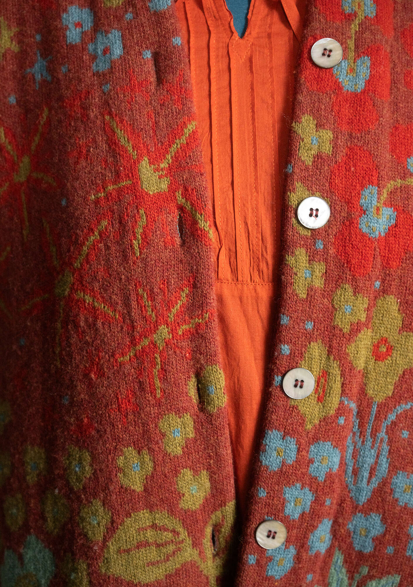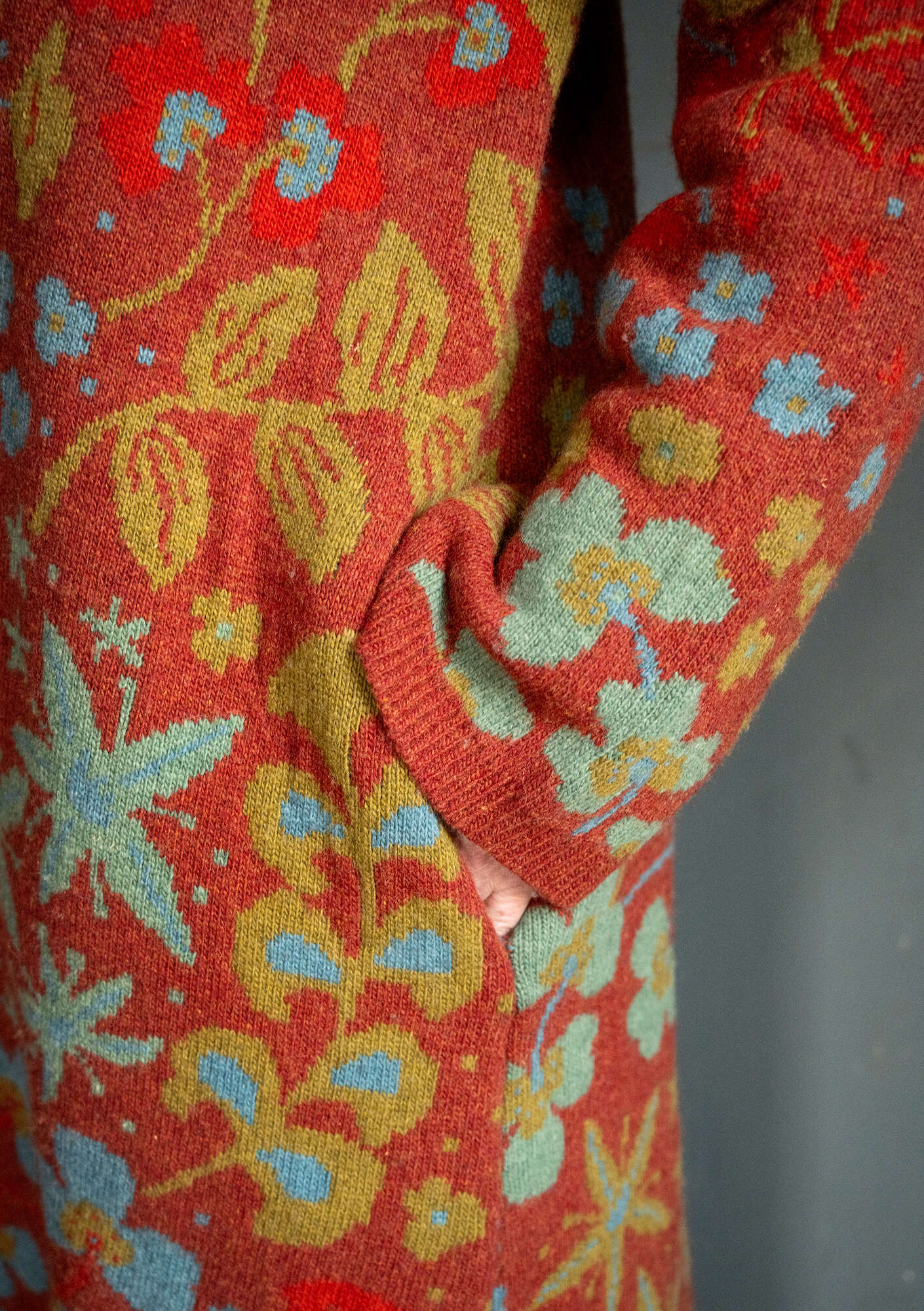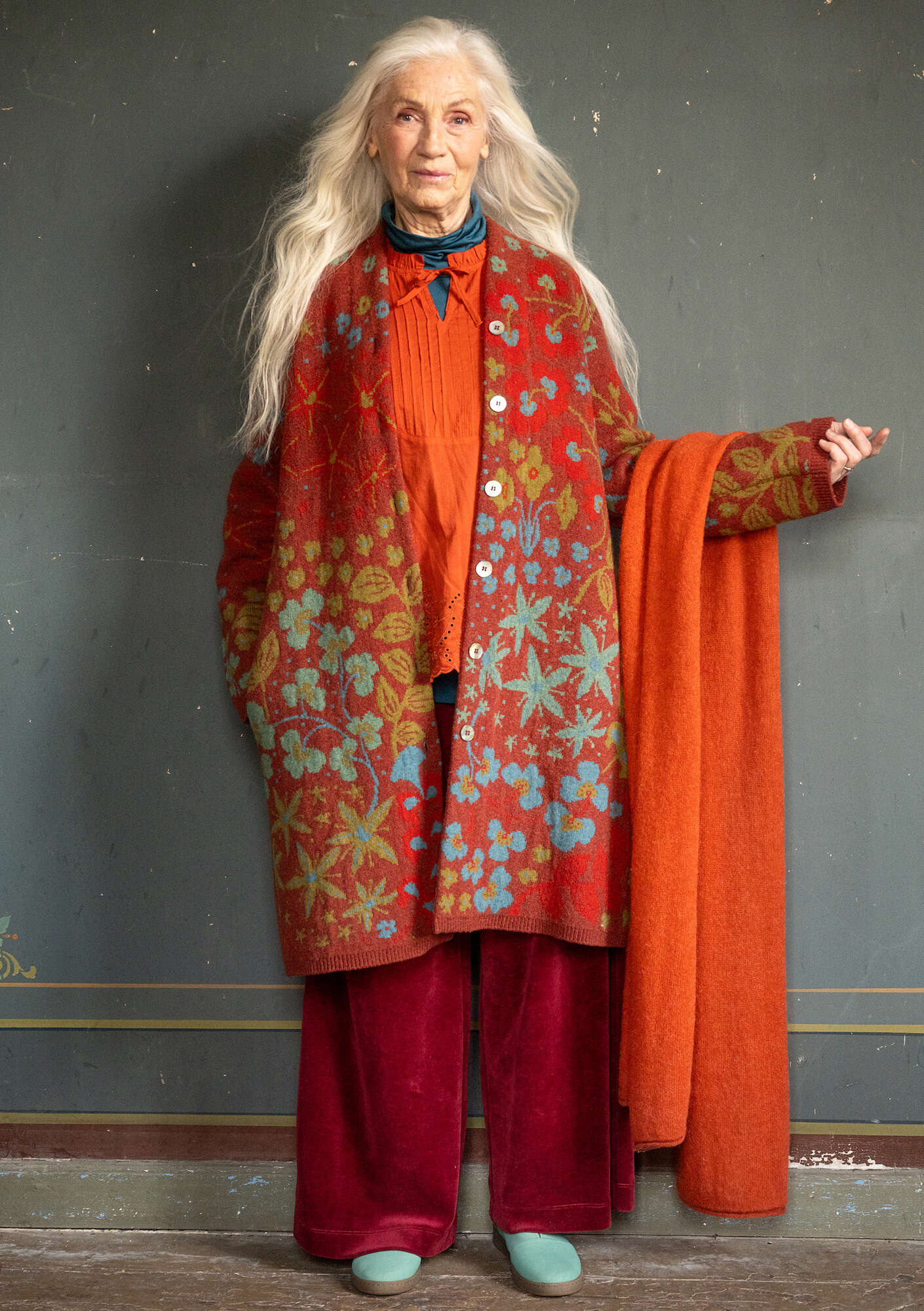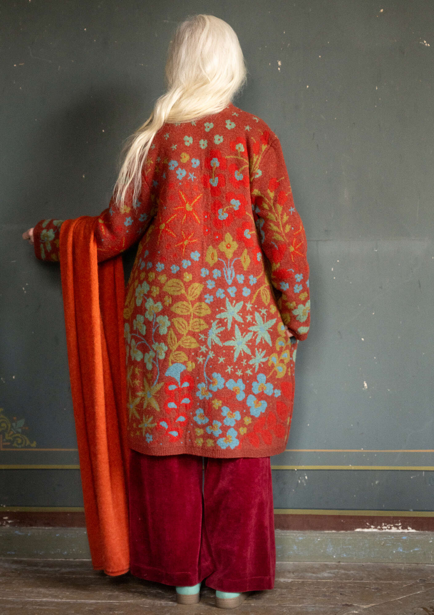 - Feel chic and stylish in this long jacquard coatigan with its front and back placement print. Featuring long sleeves, side pockets, a slightly taller collar and mother-of-pearl buttons.