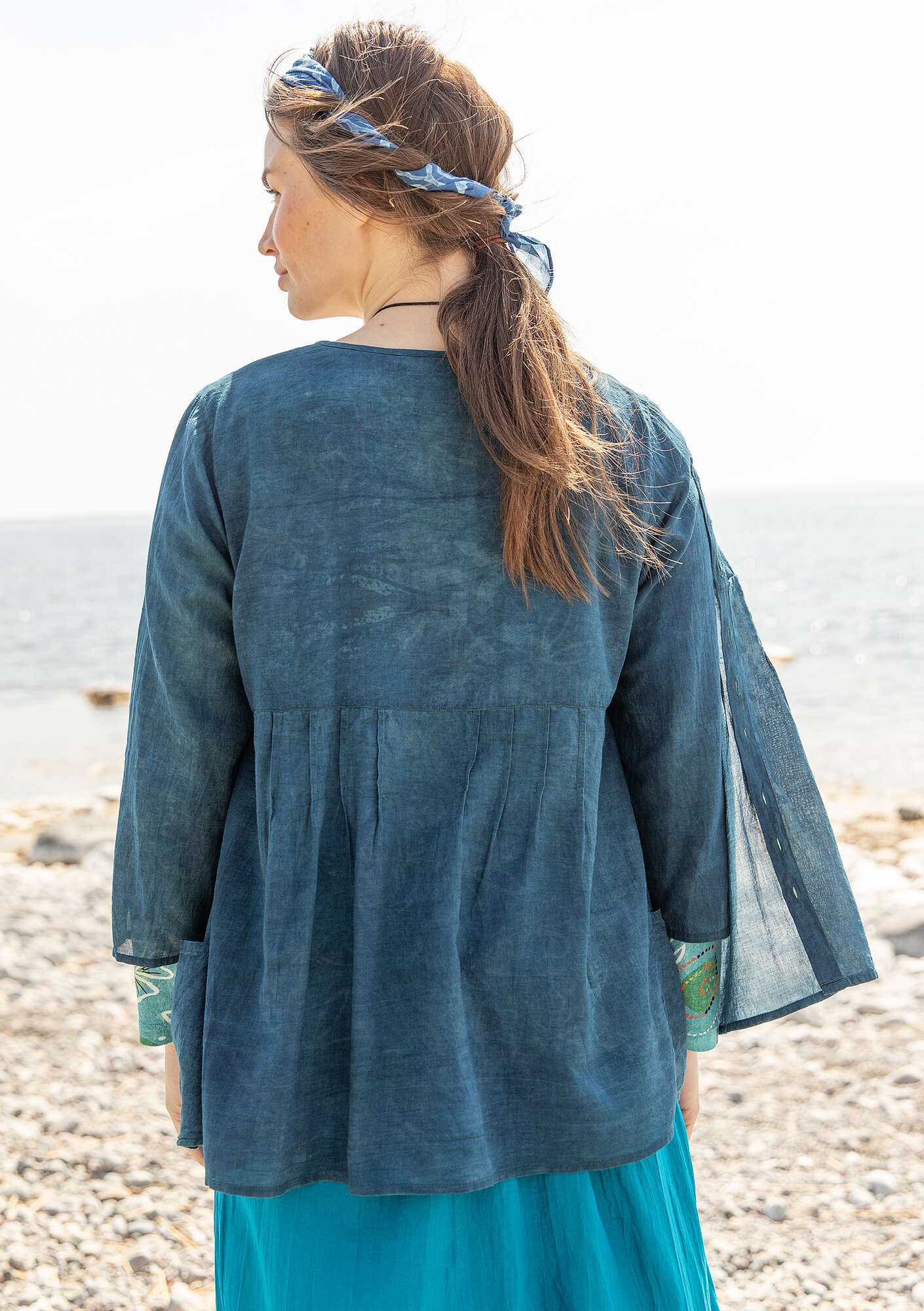 - Fully buttoned blouse dyed with vegetable dyes. Seam under the bust with pintucks on front and back. V-neck, slightly longer than three-quarter sleeves and side pockets.