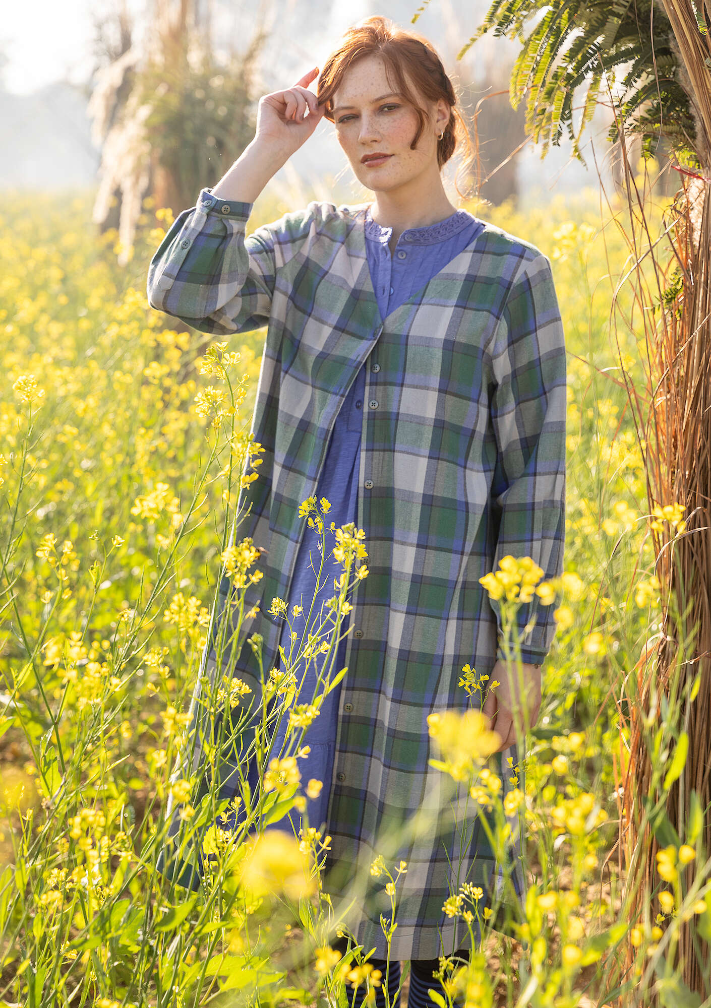 - Crafted from a woven check flannel fabric with a relaxed silhouette and v-neckline. Button-through with metal buttons that are visible on the bodice but hidden down the skirt. Gently puffed, full-length sleeves. Side slits and side pockets.