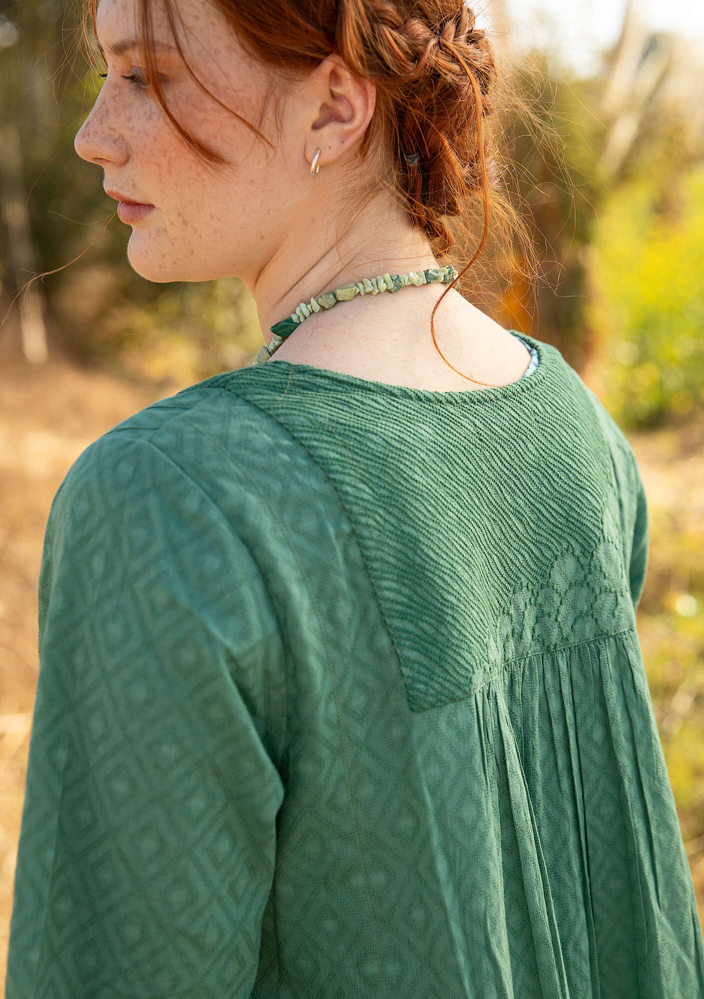 - Romantic style dress with a beautiful drape. Embroidered yoke, gathers and also pintucks both front and back, giving the skirt extra volume. Crafted from a dobby fabric with a lace hem. The straight sleeves end just below the elbow. Metal button placket on the bodice.