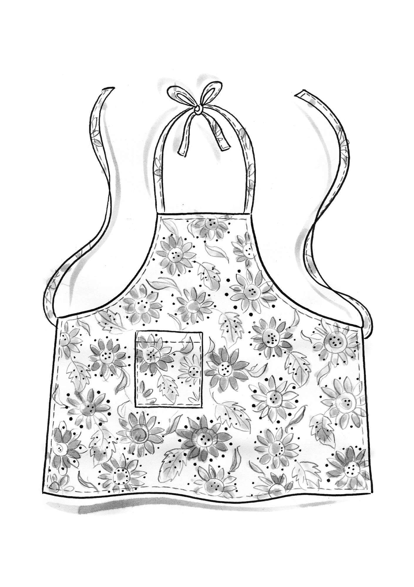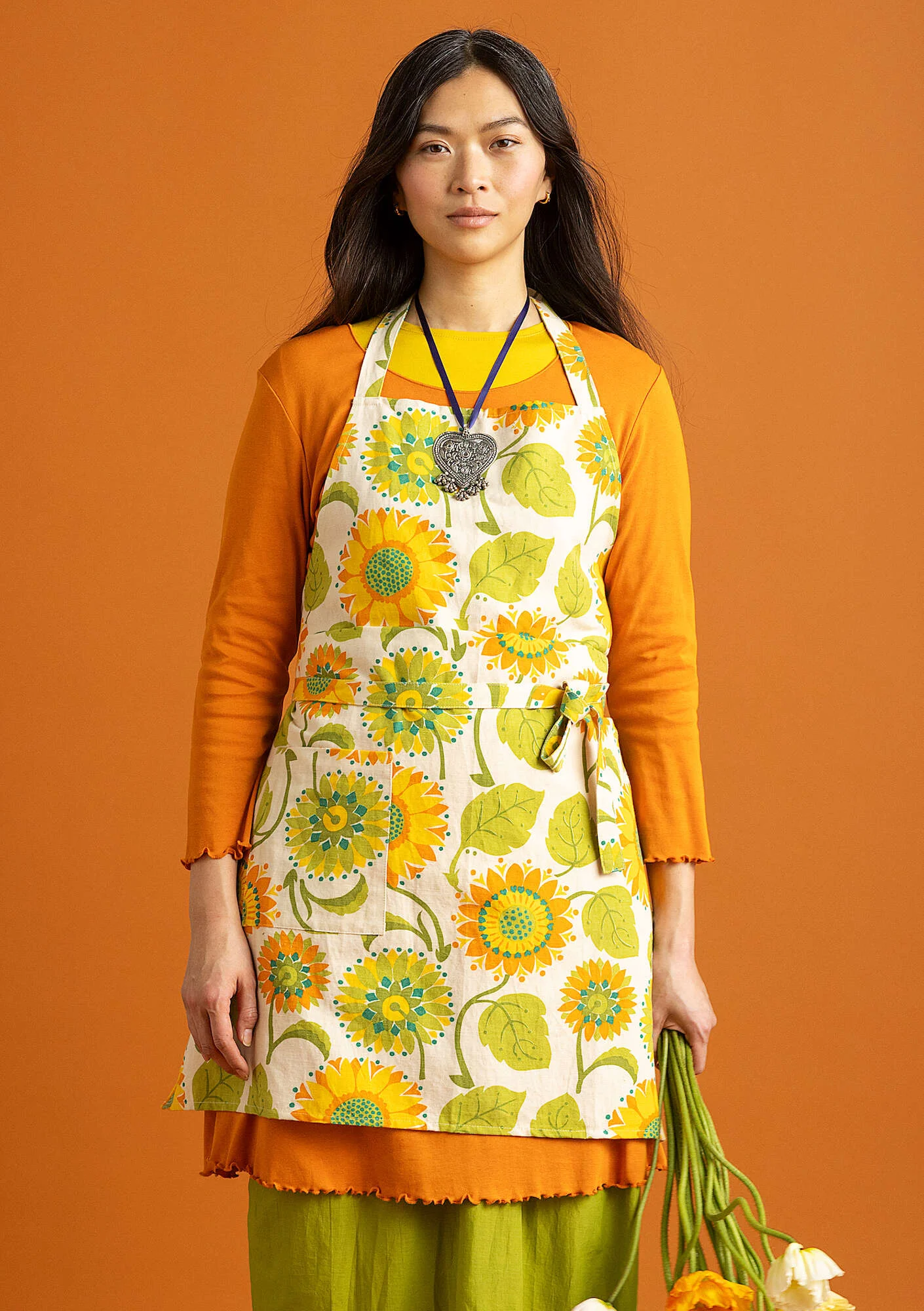 - A delightful apron featuring our gorgeous u201cSunfloweru201d print. Neck and waist ties for easy adjustment. One front patch pocket. Crafted from a linen/cotton fabric with a lightly textured finish.
