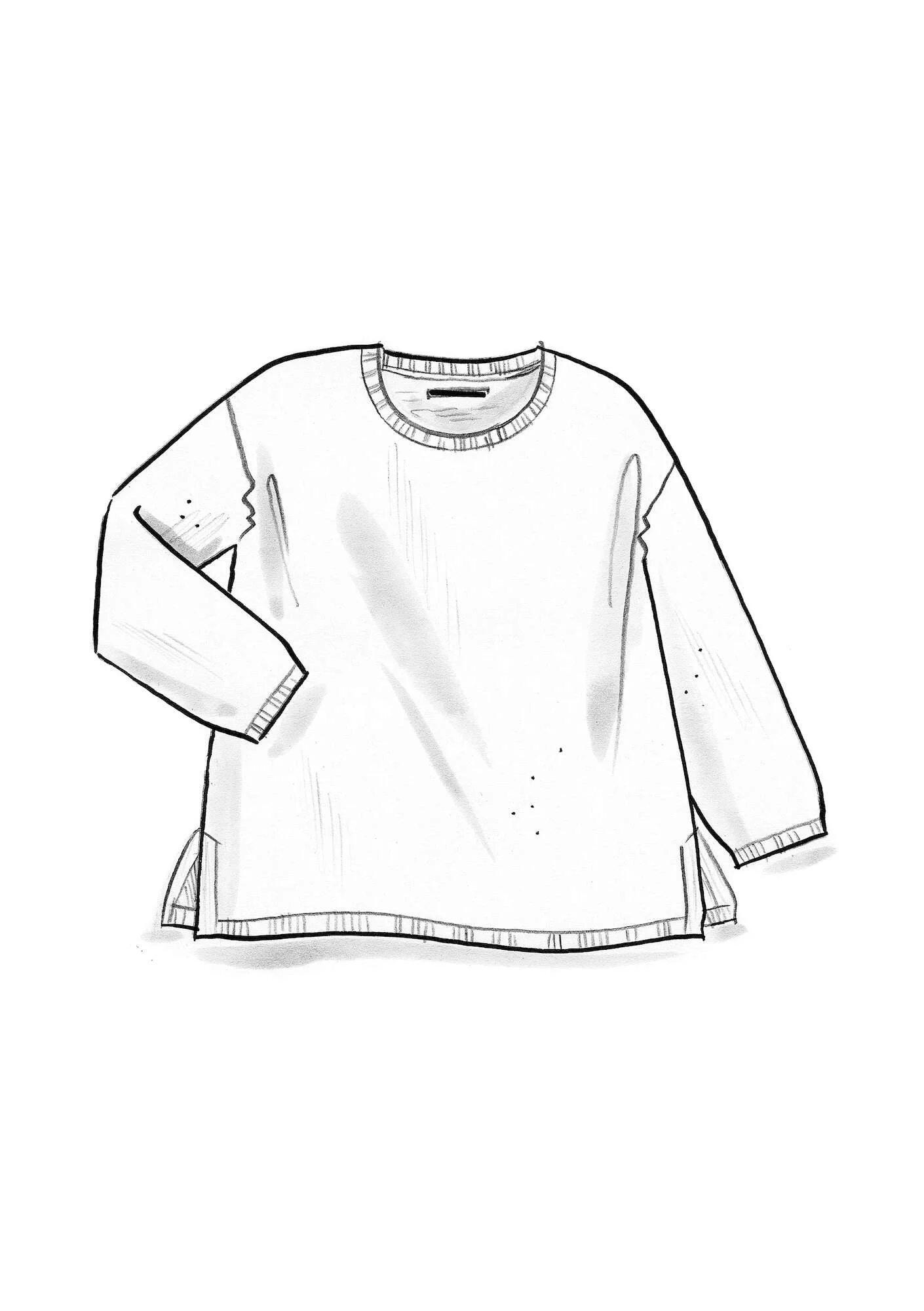 - Style with drop shoulders and three-quarter sleeves. Lovely ribbing at the neckline, cuffs and lower hem. Pretty side slits. Light and laid-back for any occasion.