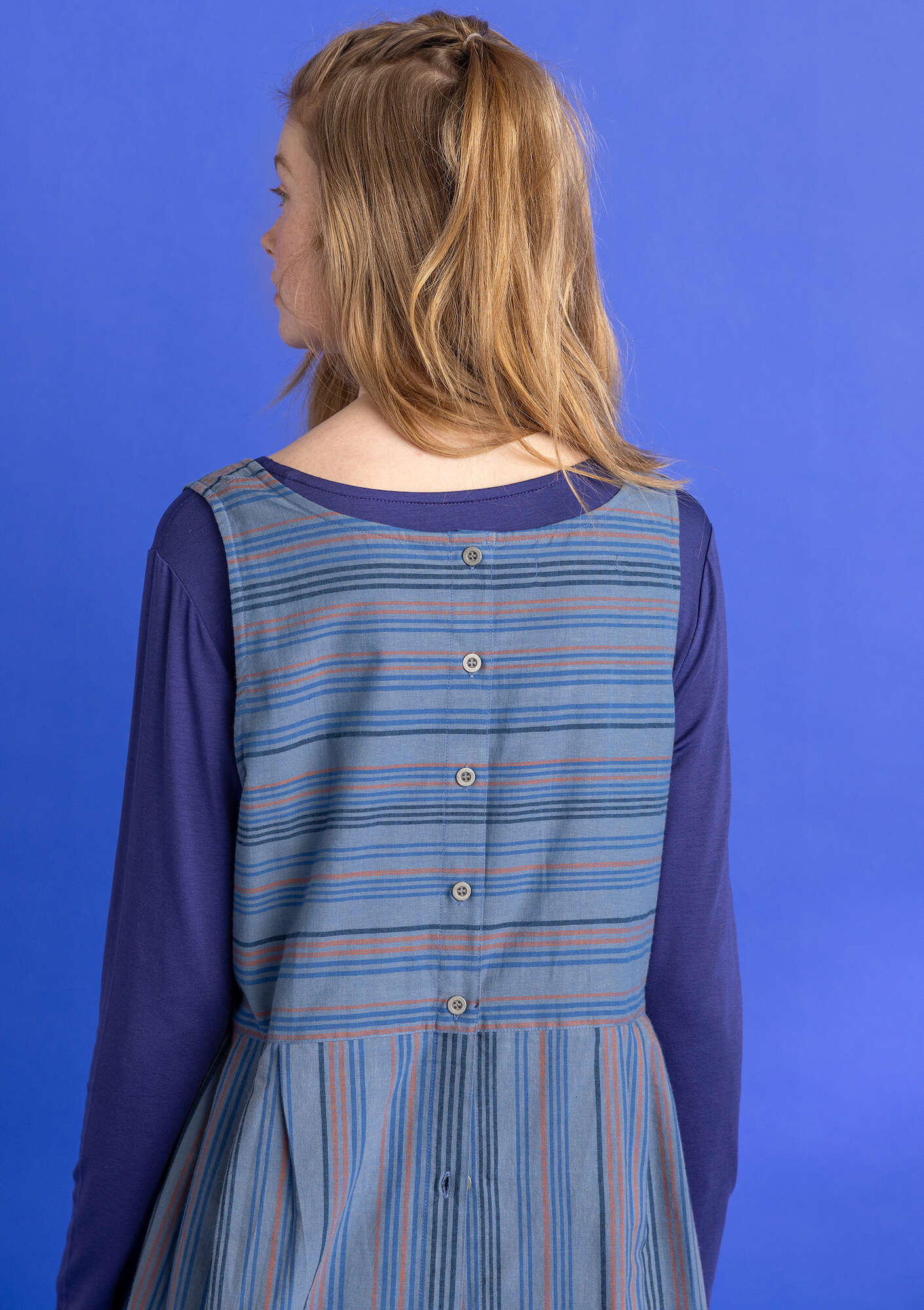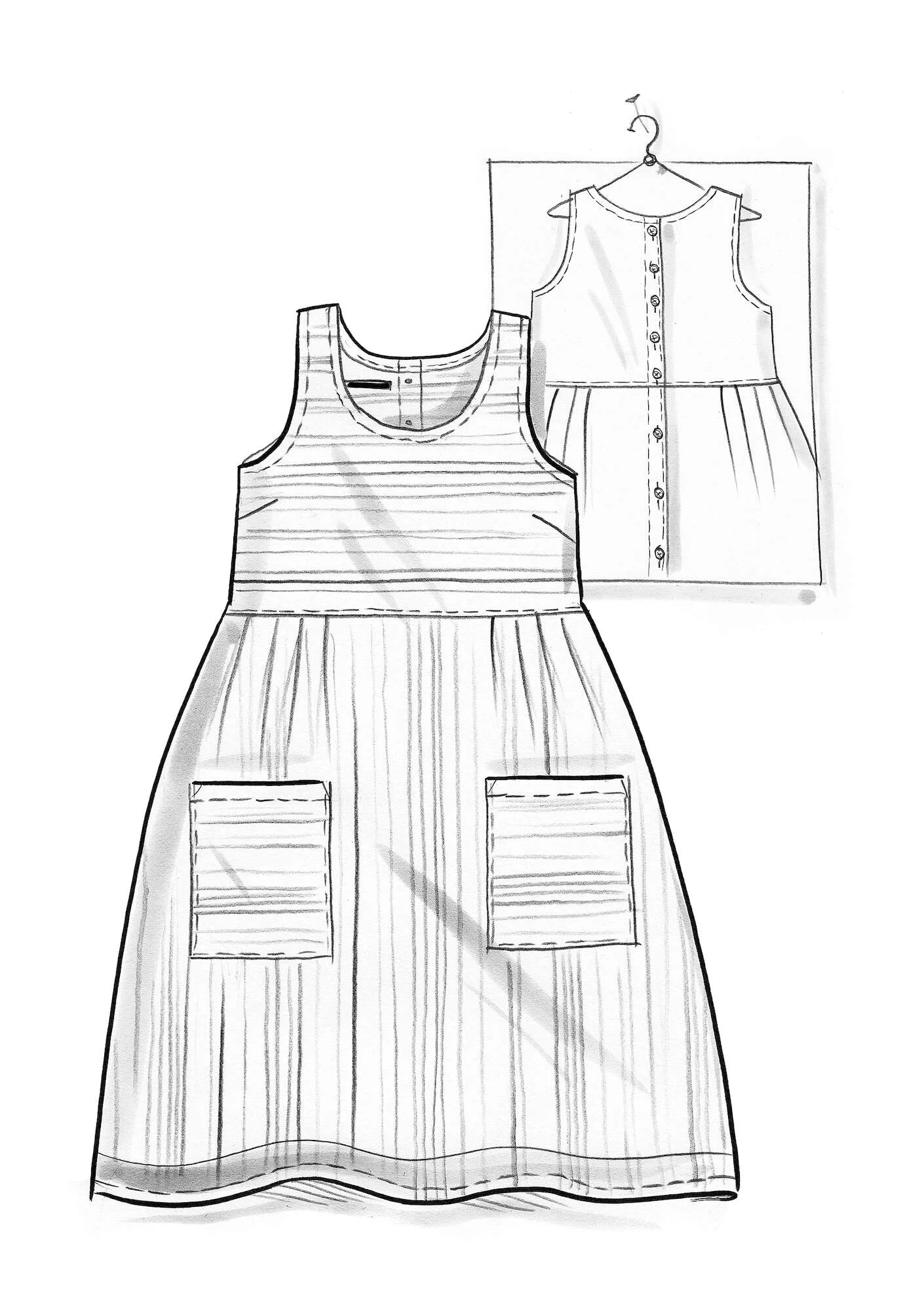 - Multicolored woven stripes adorn our sleeveless dress. Fully buttoned at the back, with pockets in front. At the lower edge of the skirt, the selvedge of the fabric offers an accent-colored detail.