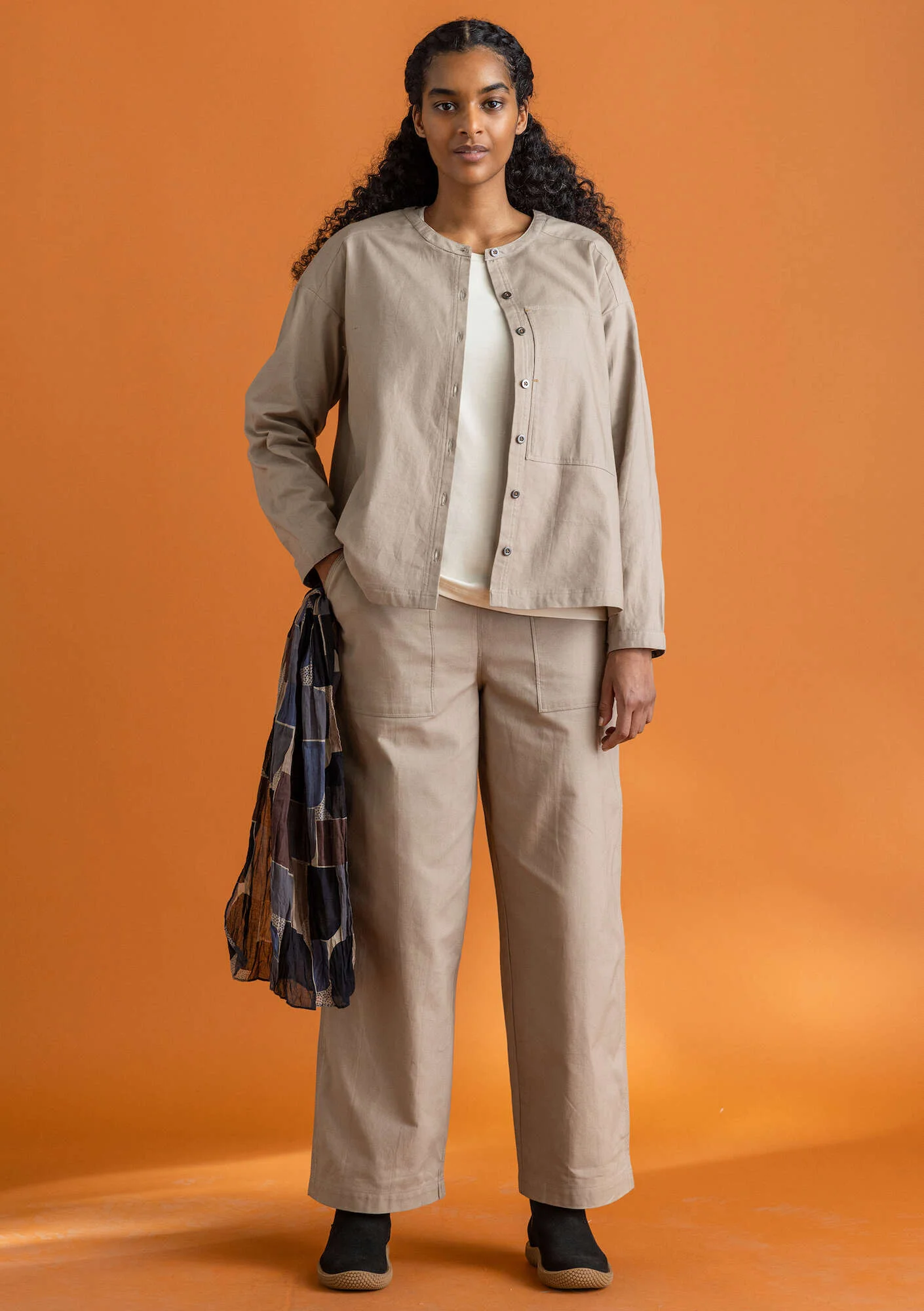 organically farmed and certified cotton, flax and hemp, wool certified as organic, Swedish wool, naturally/dew-retted flax and hemp, CmiA and BCI cotton, silk, alpaca wool, vegetable tanned and dyed leather and FSC® certified wood and natural rubber. TENCEL™, LENZING™ and ECOVERO™ are trademarks of Lenzing AG.