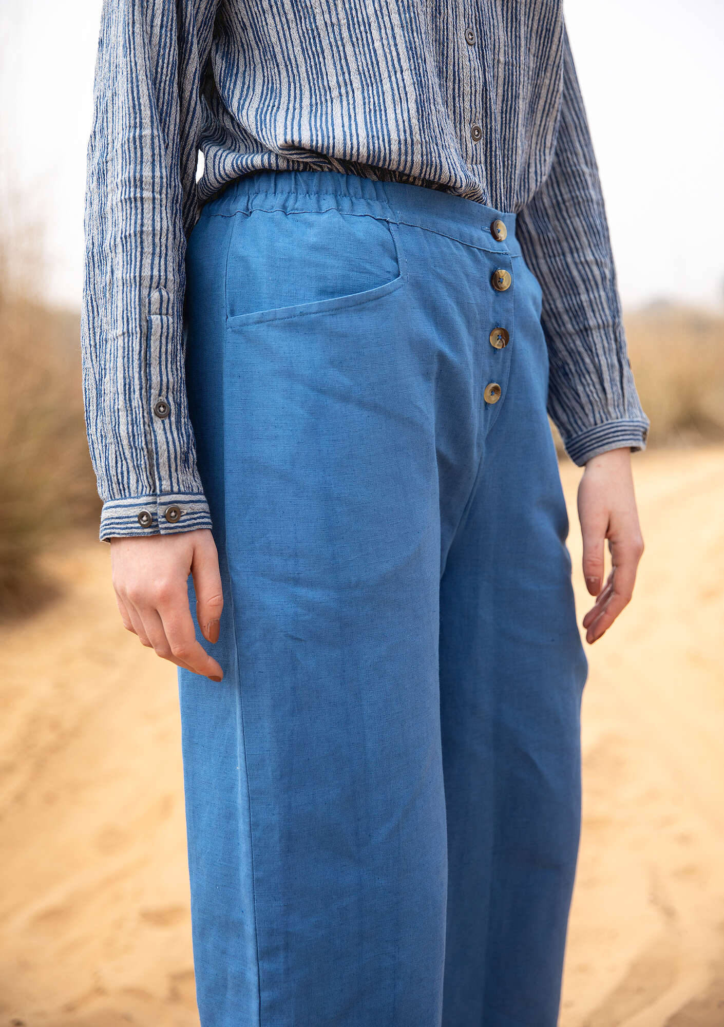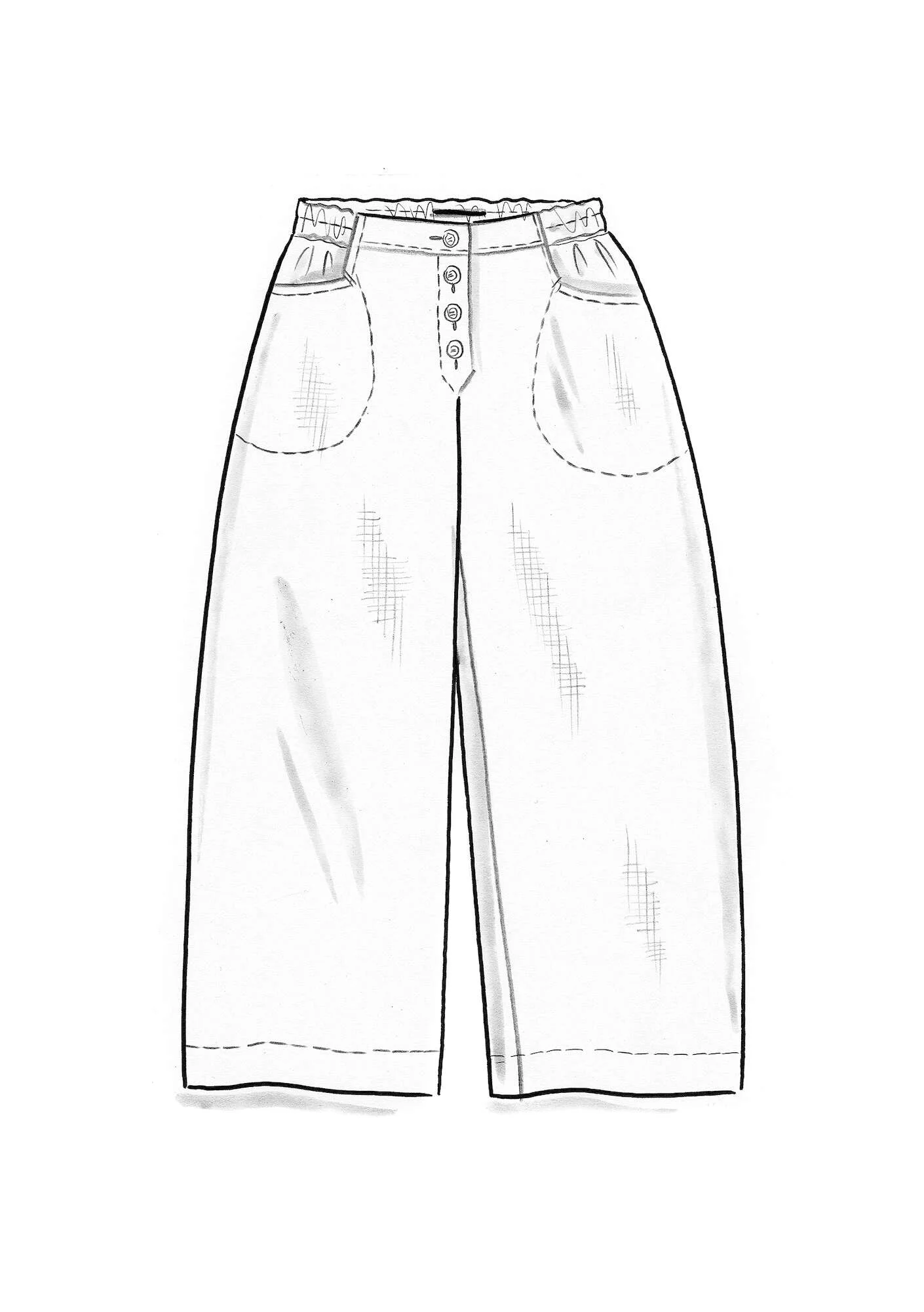 • Comfortable workwear-inspired pants. Slightly shorter leg length. Waistband with elastic at the back and sides. Comfy inner pockets and variegated buttons at the fly.