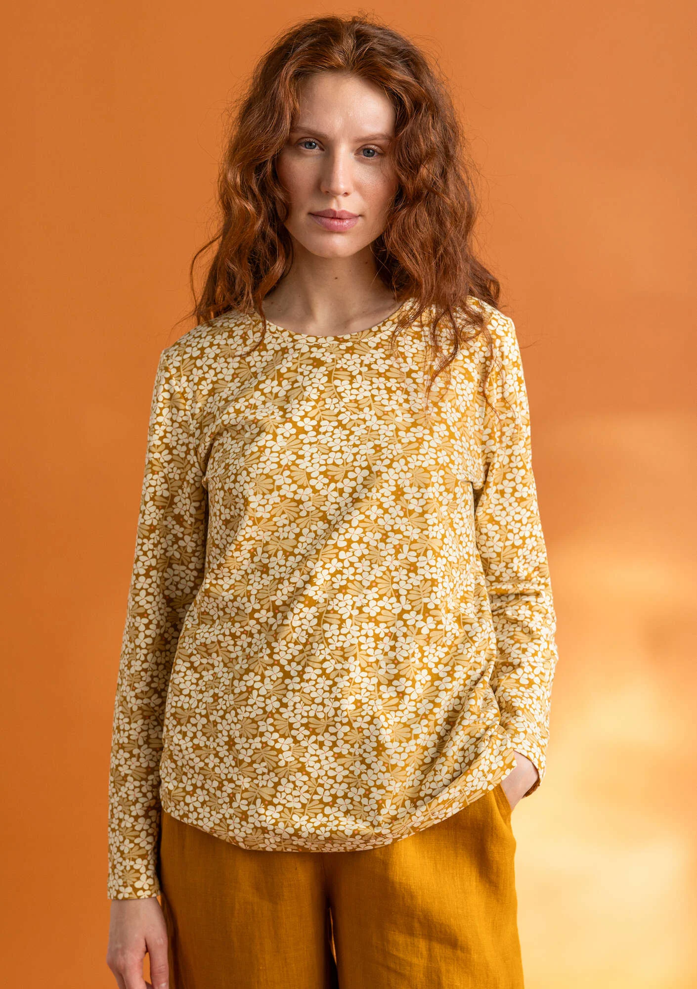 - Versatile style with a round neckline and full-length sleeves. Comes in both solids and with little printed u201cYlvau201d blossoms.