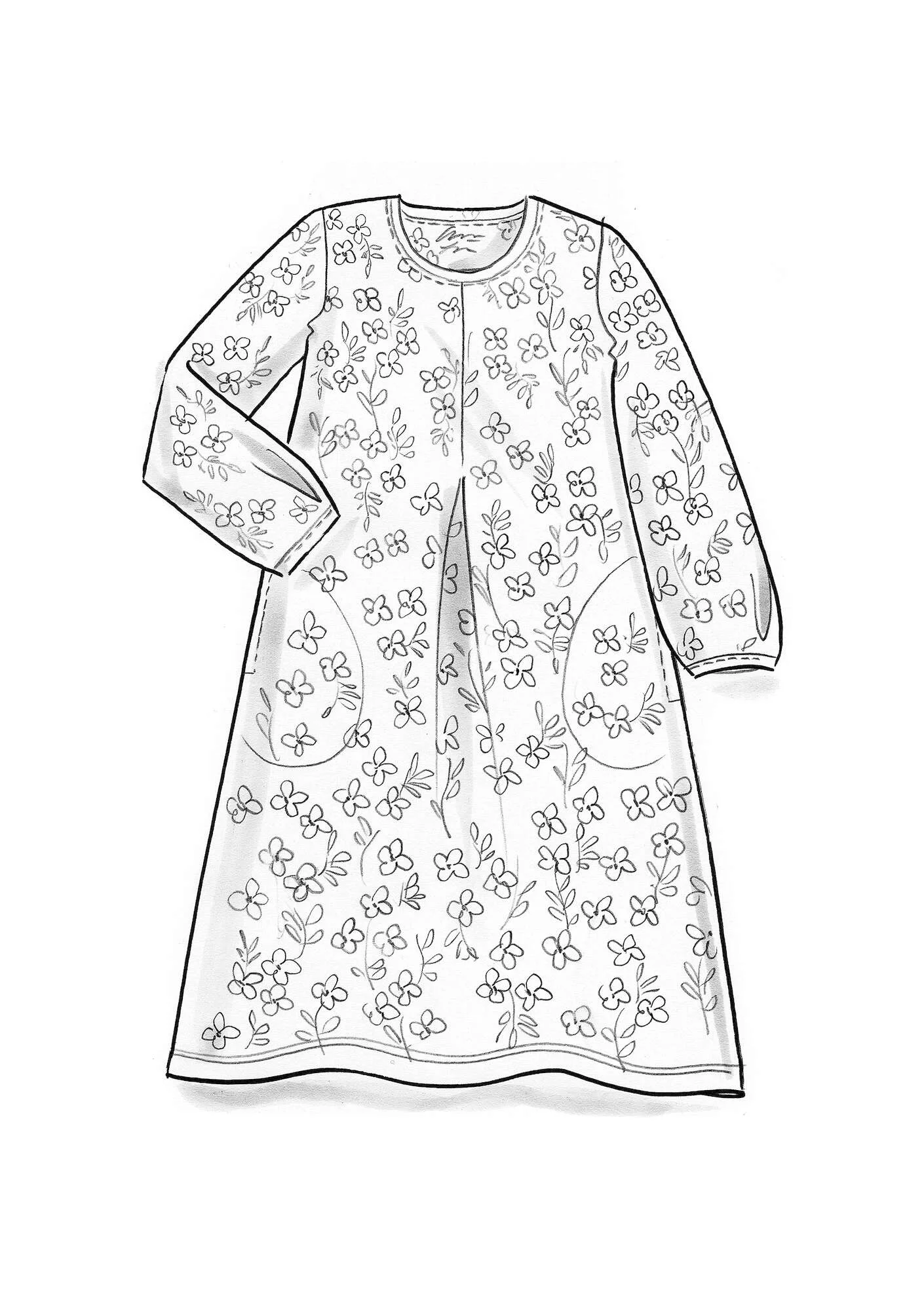• A simple silhouette with a stitched-down front box pleat. A pleat gives the three-quarter sleeve an attractive shape. Available with our u201cYlvau201d design and in solid colours too. Side pockets.
