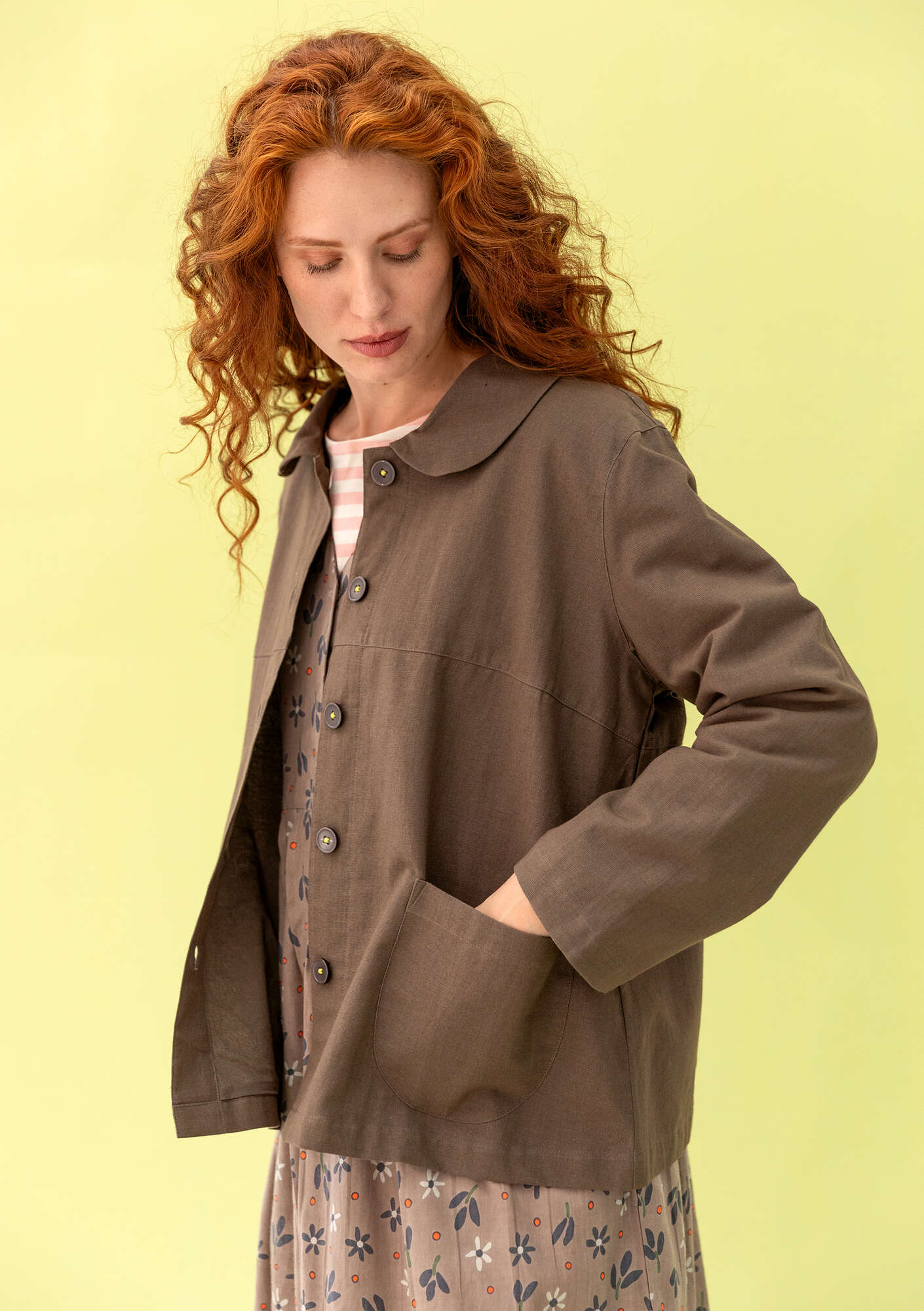 Relaxed-fit jacket with a round collar. Fully-lined garment with a light and flowy cotton voile fabric. Patch pockets with a curved hemline. Matte buttons sewn with contrast colour thread.